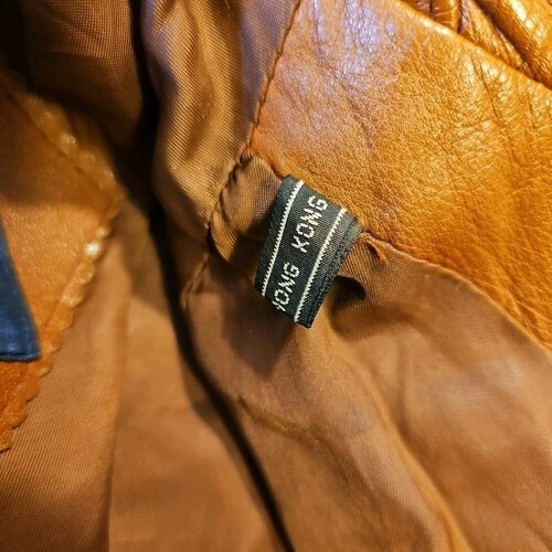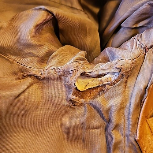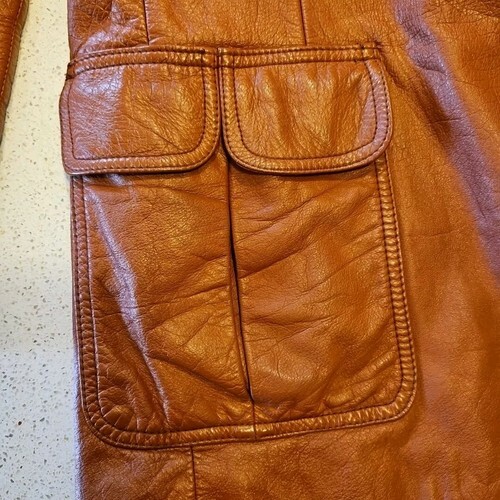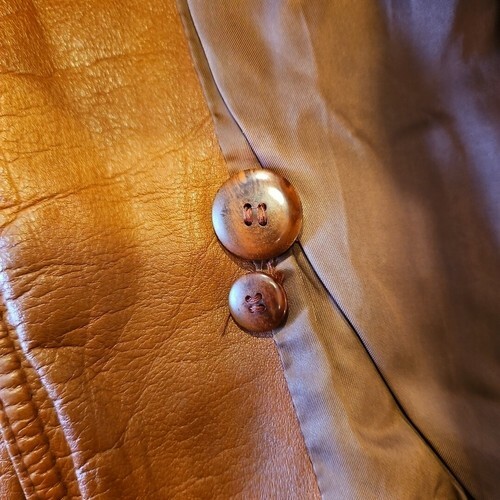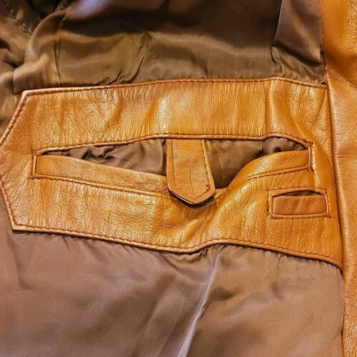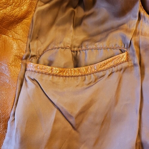 No pronounced odors. Lining has holes on both armpits and a right sleeve cuff hole. Inside pocket is missing the button. Leather is in supple condition with normal wear.