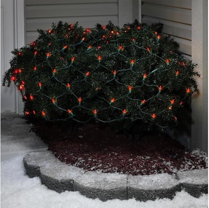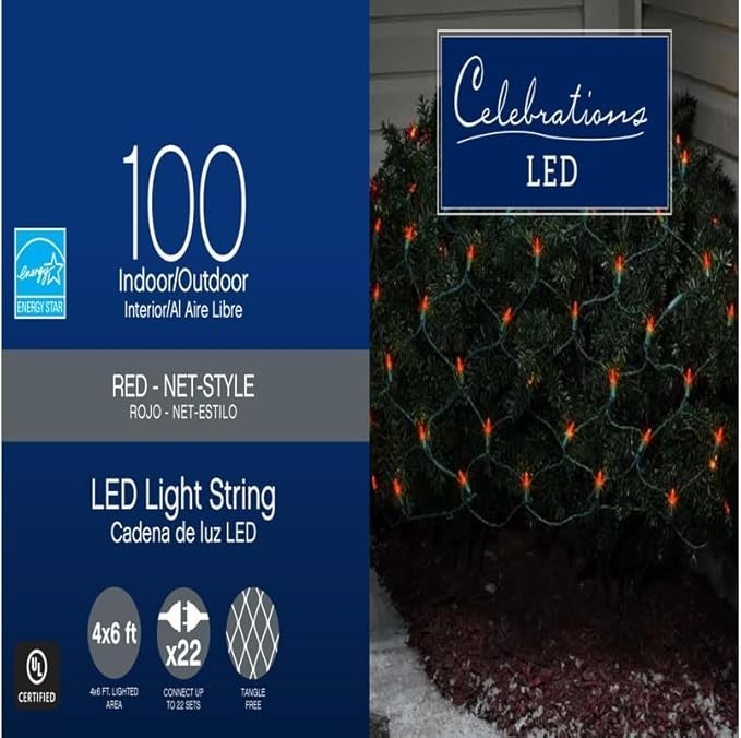 The Celebrations 40802-71 LED Net Light Set features 100 red LED bulbs arranged in a 4-foot by 6-foot grid pattern, designed for quick and even coverage of shrubs, hedges, walls, or indoor backdrops. The green wire blends naturally with greenery, while the waterproof construction ensures reliable performance in outdoor winter conditions. With a 12-inch lead-in cord and remote control for easy operation, this energy-efficient set delivers a traditional holiday look with modern LED benefits?cool to the touch, low power consumption (6W), and durable enough for seasonal reuse. Ideal for Christmas displays, it provides vibrant red illumination that stands out day or night.