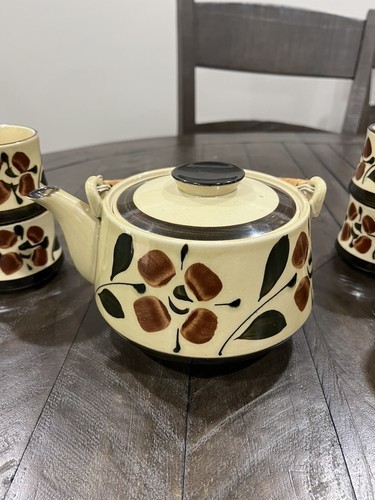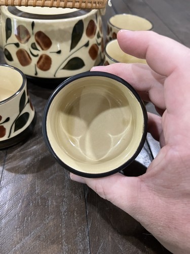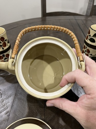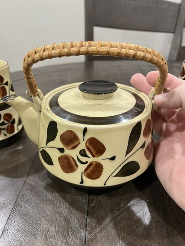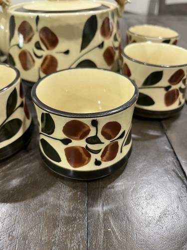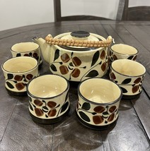 Japanese Style Teapot Bamboo Handle 6 Sake Cup Set Floral brown Stoneware