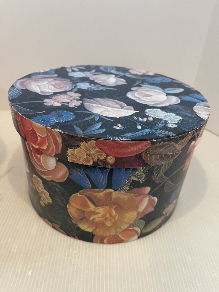 new flower hat box, top is faded. Plus Vintage Thread spool, I used for Hat Stand.
