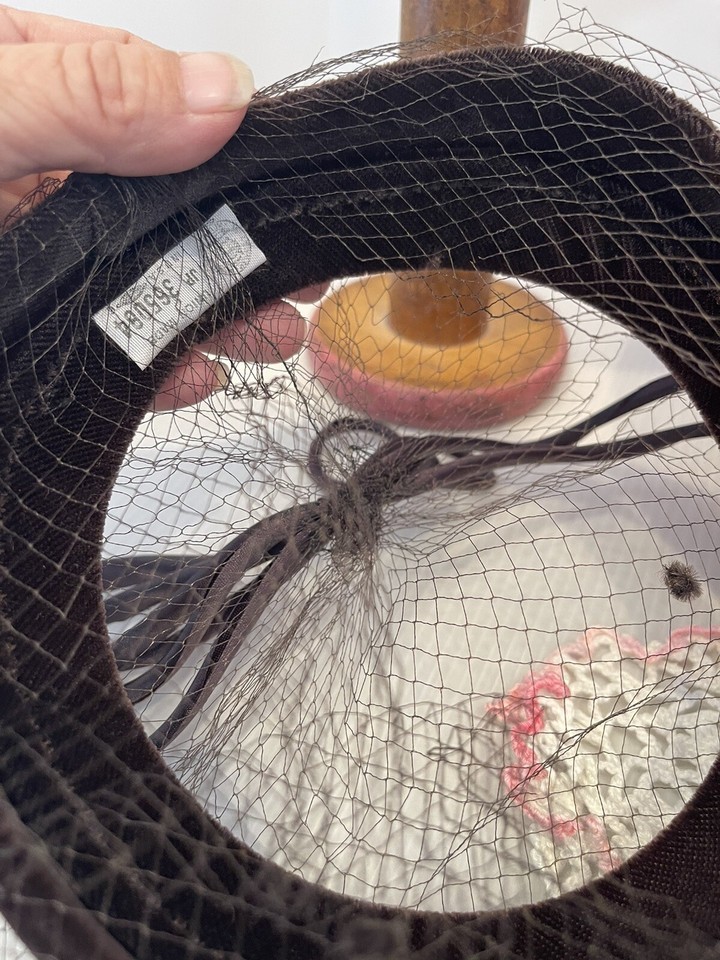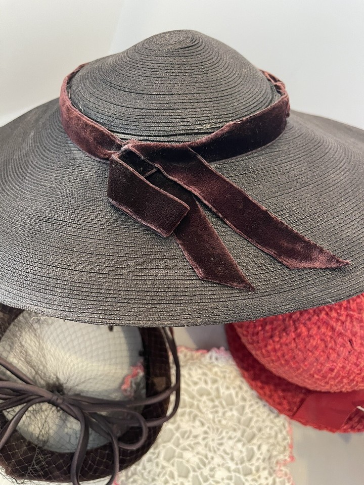 Clemar, by Wesco black straw hat with burgundy velvet ribbon.