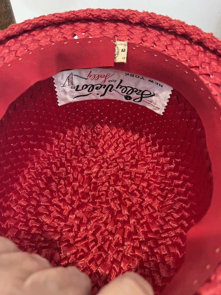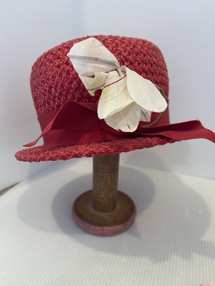 Sally Viclor, red straw Hat with Red ribbon and off-white flower