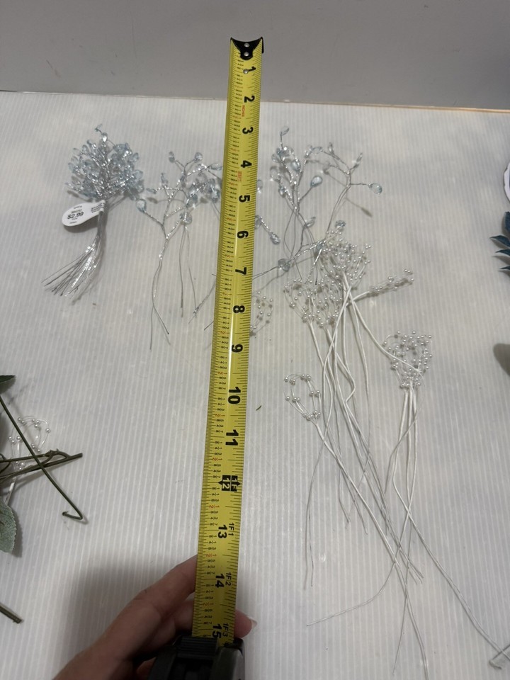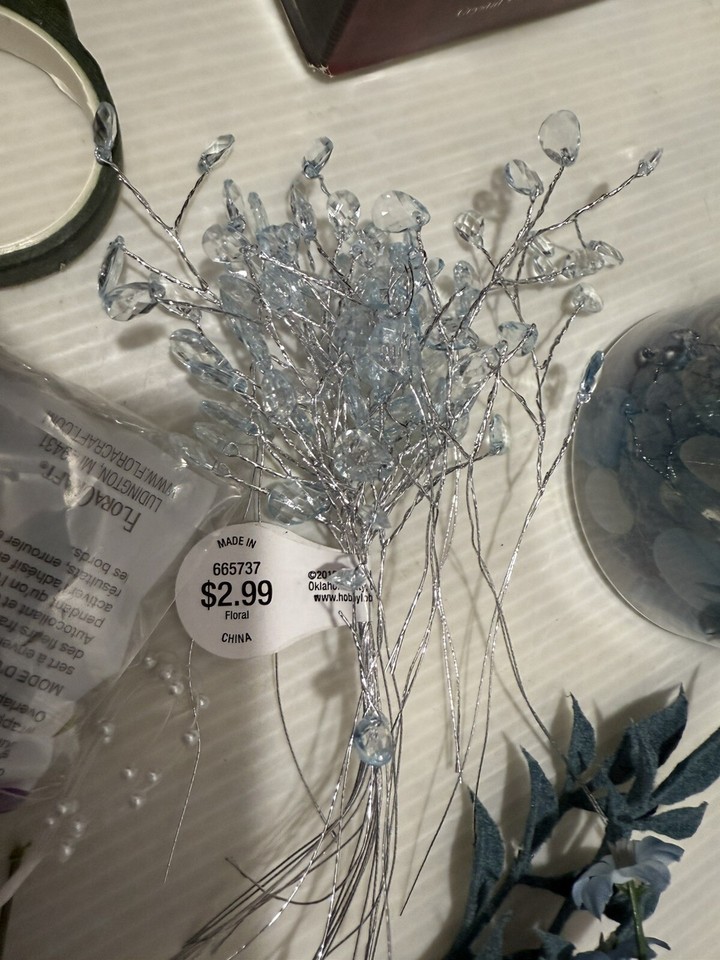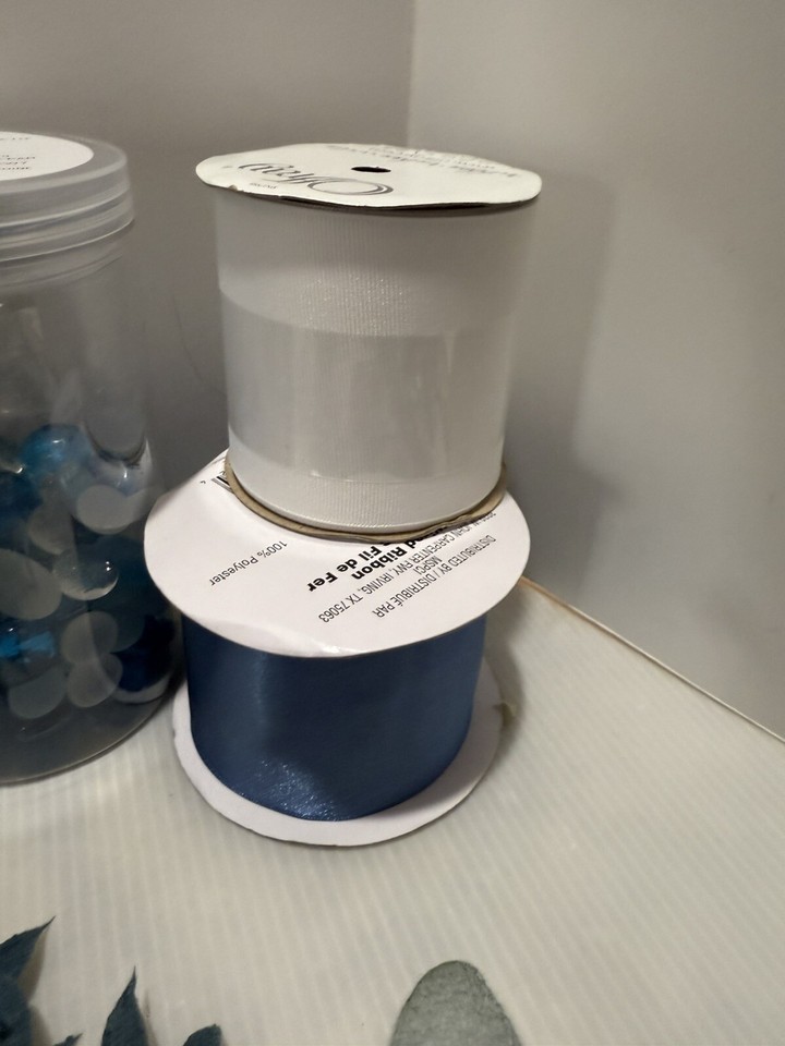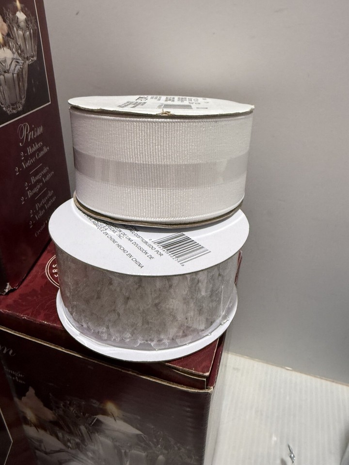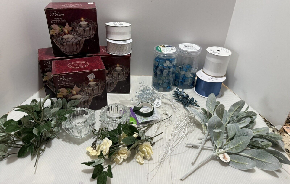 Flowers (silk), miscellaneous ribbons all new, but the Steal blue color has some missing, Glass Bud Candles 2per box (total 8pc) 2 pks of glass beads (blue) one not full.
