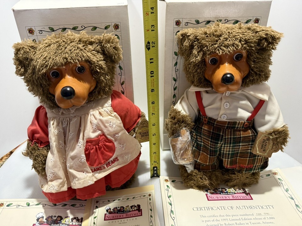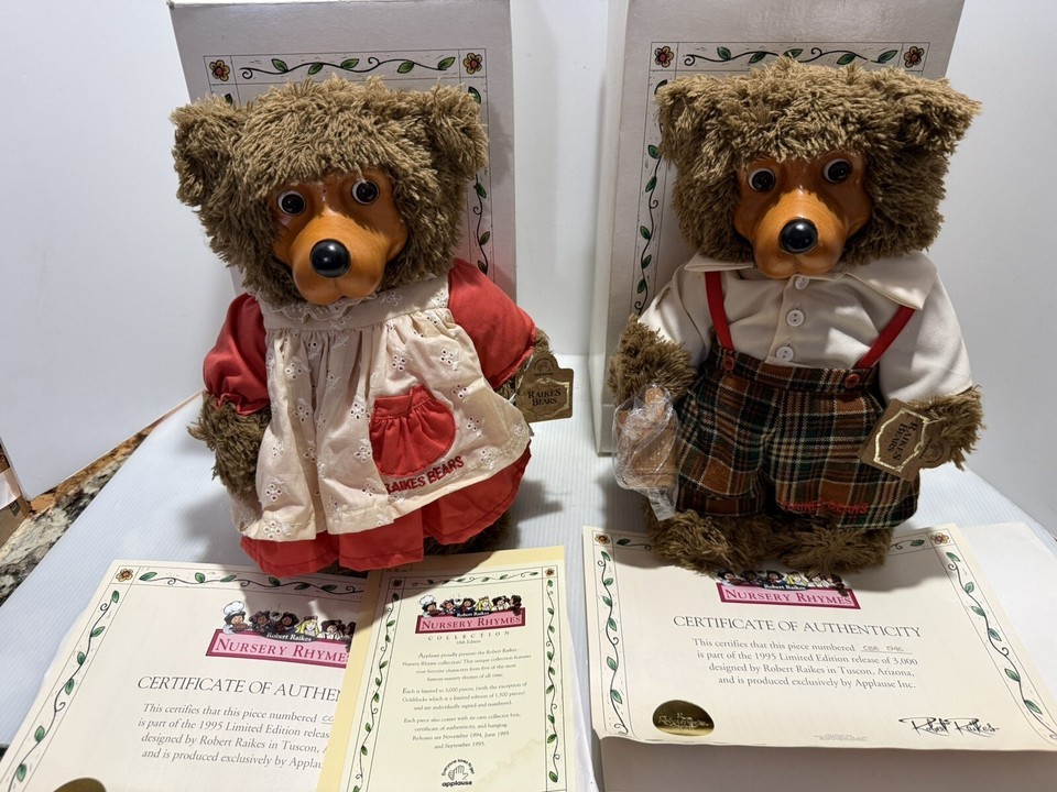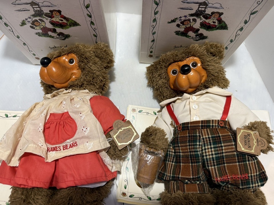 Raikes bears. Jack and Jill. Jack is number 1945 out of 3000 Jill is 1522 out of 3000. COMES WITH ORIGINAL PAPERWORK AND ORIGINAL BOX