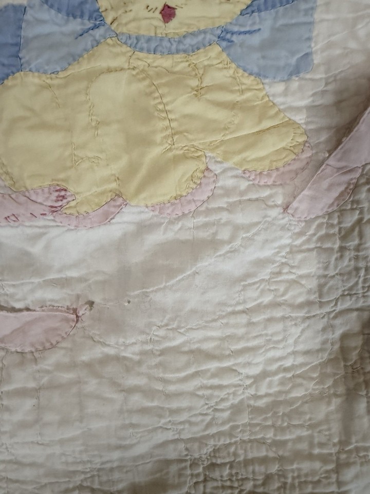 of white, yellow pink. Applique Puppy dog and kitten. Puppy has a free stand floppy ear.