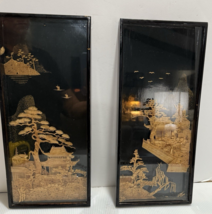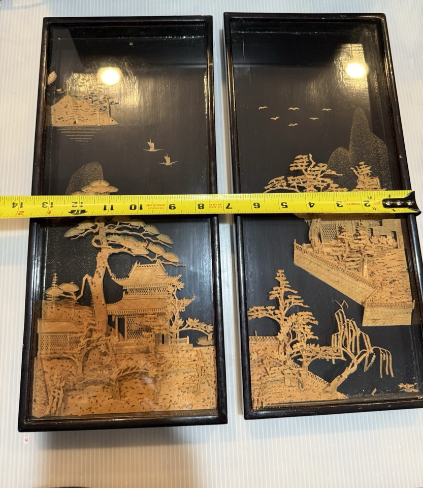 2pc lot Asian Carved Cork Diorama Hand Carved Landscape Birds Scene