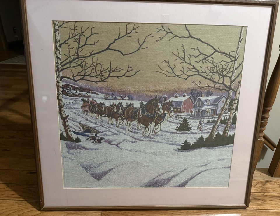 Winter Scene Clydesdal House Snow Barn Country Cross Stitch Framed