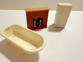 This vintage 3-piece miniature dollhouse furniture set includes a tub, fireplace, and icebox, all made of white plastic. This original set from the early 20th century is a lot sold together, offering collectors a rare and charming addition to their dollhouse miniatures collection.