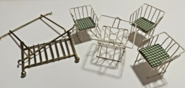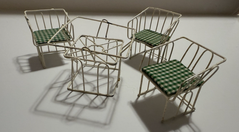 Dollhouse Furniture White Wire Table & 3 Chairs Plaid Green/White Vintage