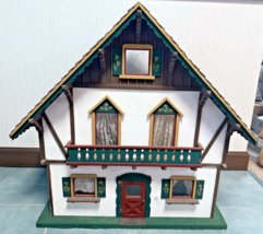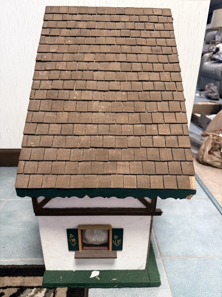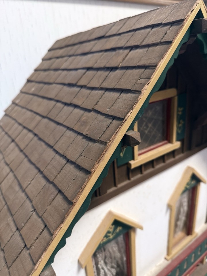 This vintage 1970s English dollhouse is a charming example of a Tudor-style stand house, perfect for collectors and enthusiasts of antique dollhouses. Handmade with real brick, stucco paint, and a real white stoned chimney, this 1:12 scale house features six rooms, including a bathroom, kitchen, bedrooms, living room, hallway, nursery, and dining room