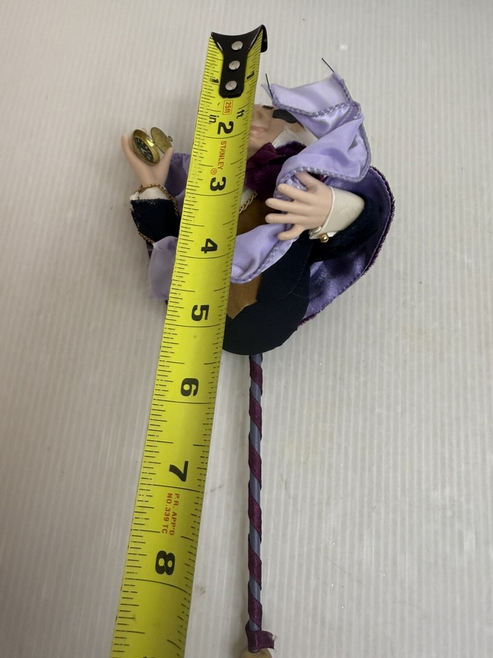 Crafted from porcelain and fabric, it features a delicate face and hands