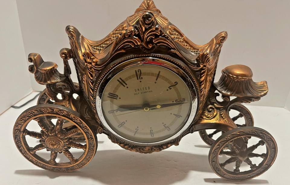 This antique United Clock Corp. carriage clock features a vintage quartz movement and an elegant gold finish. The self-starting clock is made of brass and metal, with a frame material of brass. Originally manufactured in the 1940s, this United Clock Corp. clock is a unique and decorative collectible suitable for any room. It comes in a mantle, table top, or desk style, with a numerical 1-12 display type and an analog display. Made in the United States, this clock boasts a vintage/retro style and is a true classic for collectors of unique timepieces.