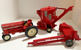Vintage 3pc Red Farm Tractor ERTL Co International Die Cast Metal Toy USA