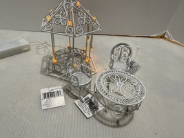 Miniature Dollhouse White Metal Furniture Patio Table 2 Chairs Rustic Wicker and lighted Gazebo with birdbath.