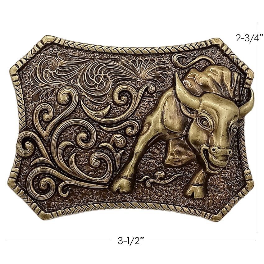 Add some cowboy flair to your outfit with this vintage brown metal belt buckle featuring a bull design. The buckle is sure to make a statement, with accents of a buckle that will give you a classic western look. Perfect for men who want to show off their love for the cowboy and western theme, this belt buckle is made of sturdy metal that will last for years to come. Its unique design will surely complement any outfit, whether you're wearing it for a special occasion or just as an everyday accessory. Fits 1-1/2 inches belt.