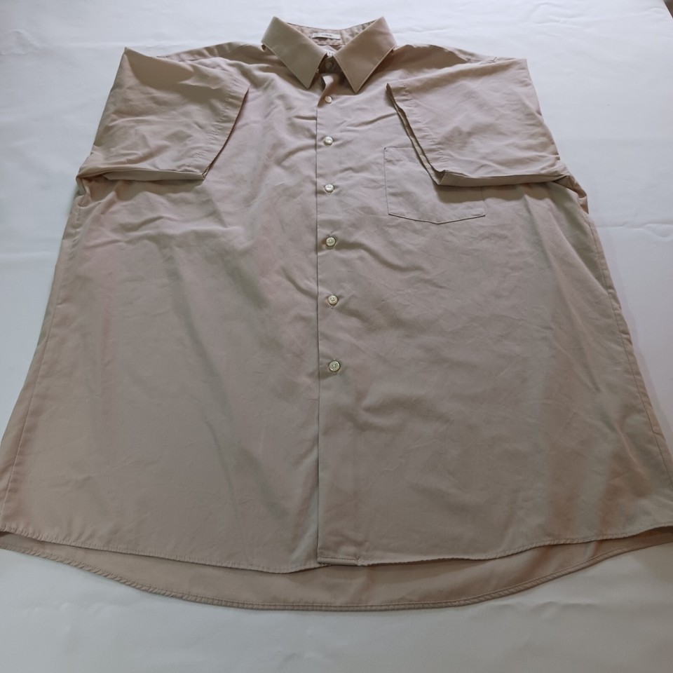 Enhance your wardrobe collection with this Van Heusen men's beige wrinkle-free button-up shirt in size 17. This solid pattern shirt is made of a comfortable cotton blend material that ensures a comfortable fit. The shirt features short sleeves, a collared neckline, spread collar style, and a button closure.