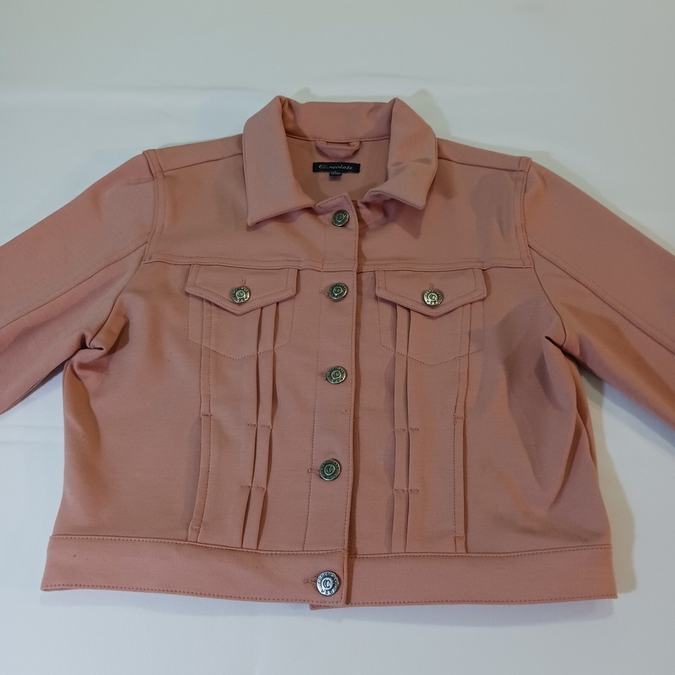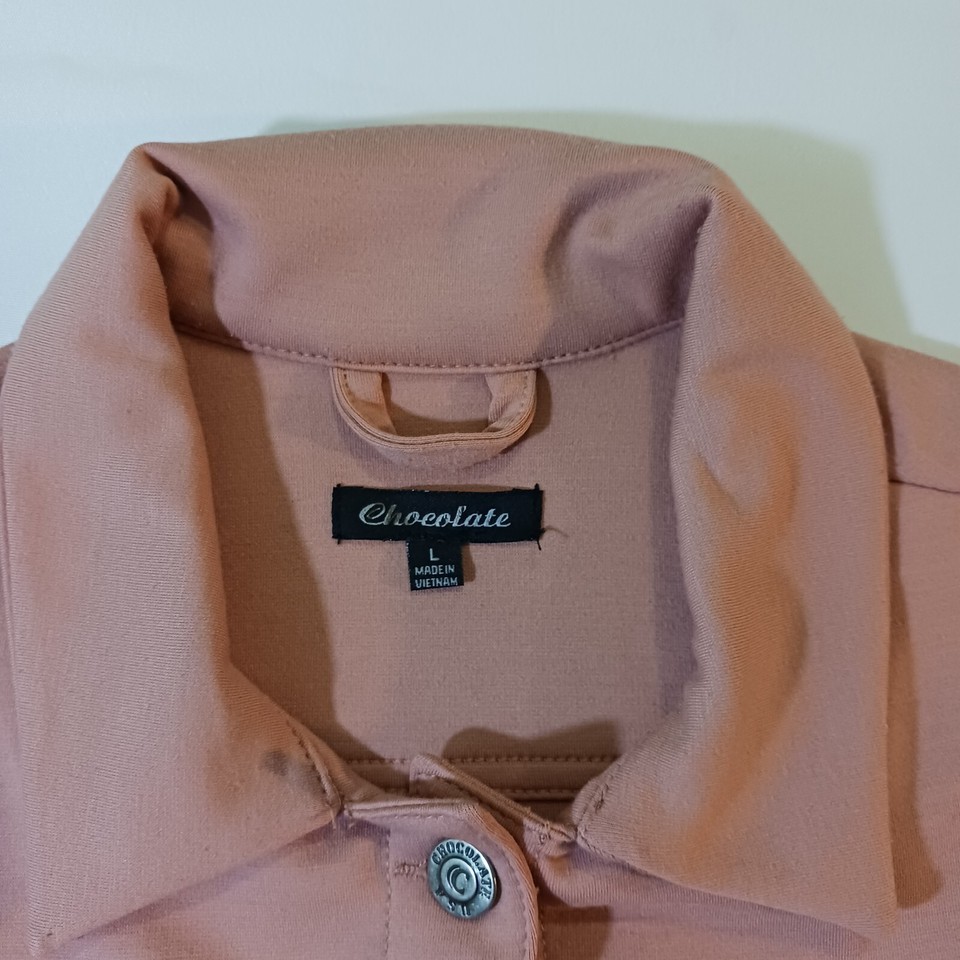 This is a pre-owned women's mini jacket made by Chocolate. The jacket is made of spandex and comes in a solid peach color. It has long sleeves and can be closed with a zip, tie, or snap. The jacket has pockets and is unlined. It is machine washable and comes in size L. The style is a basic jacket with a colorful theme. The jacket is not personalized and is a regular size. It was made in Vietnam and is not handmade.