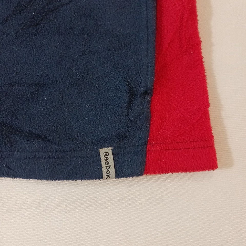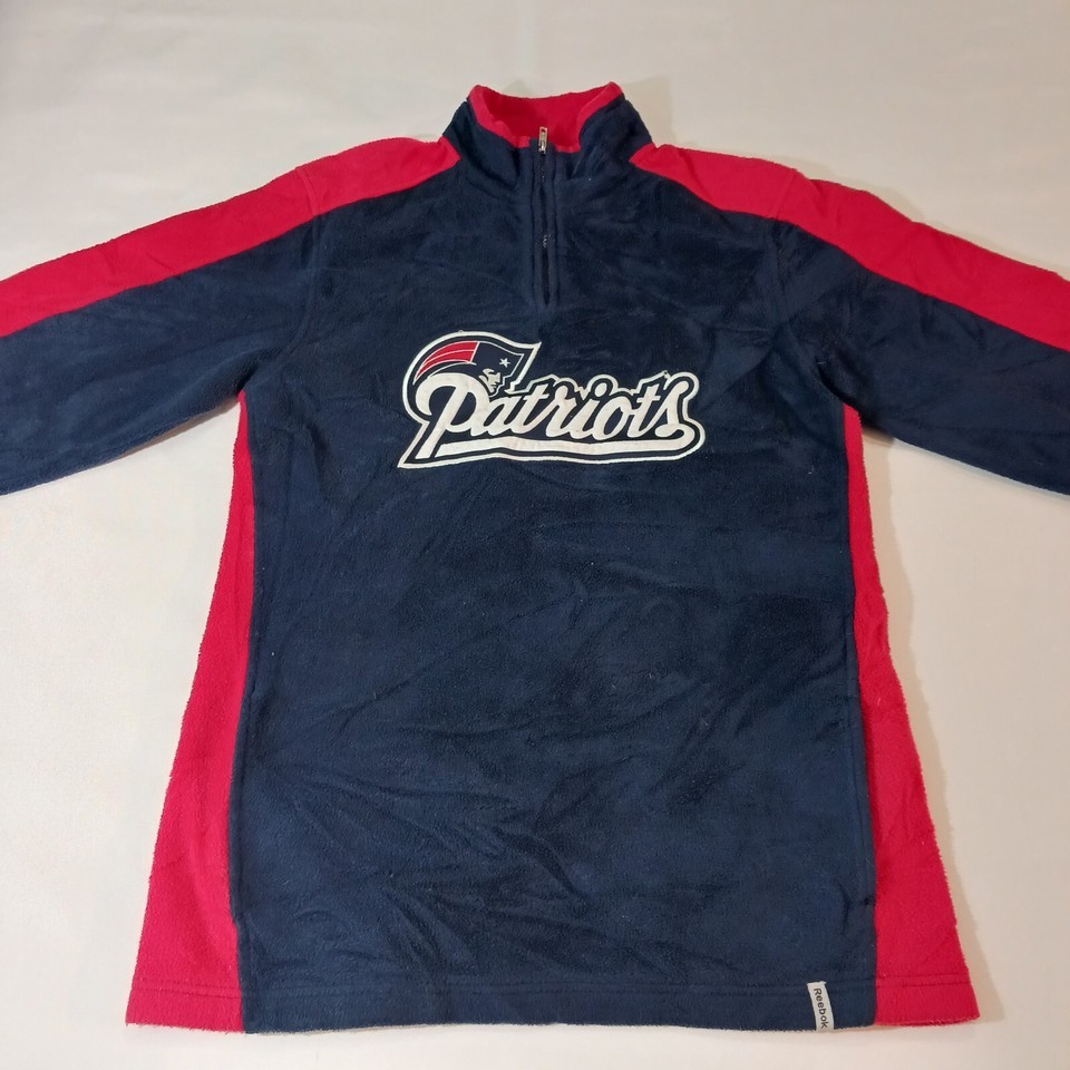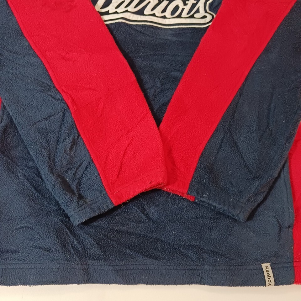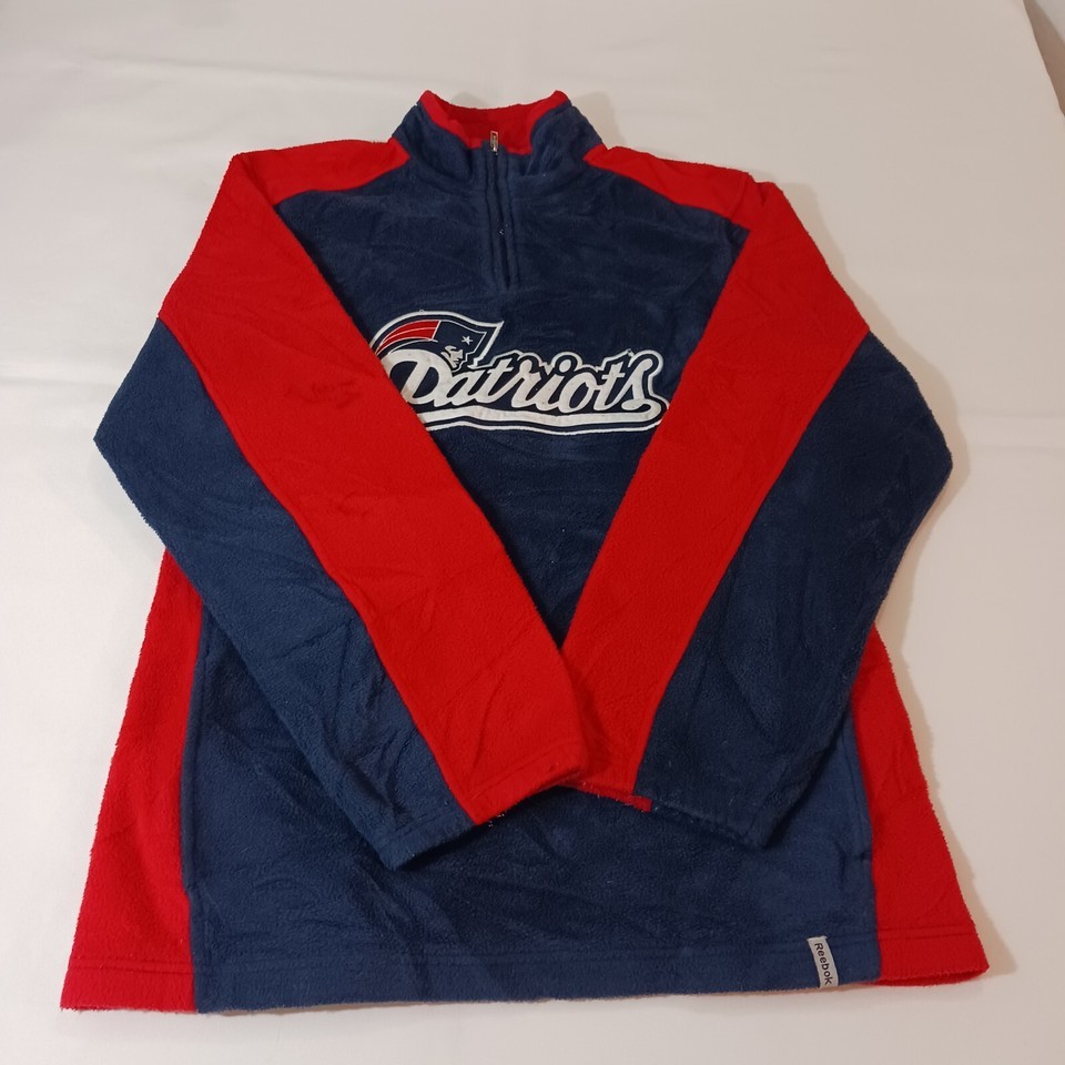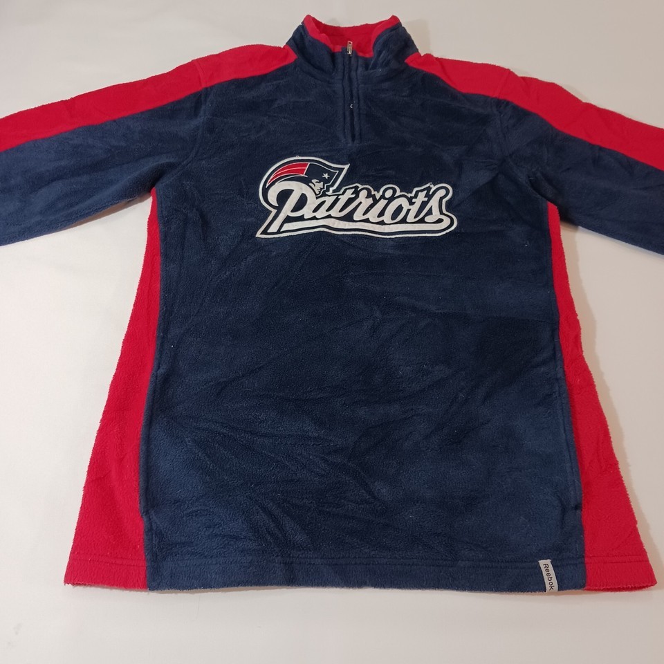 This is a Reebok youth XL pullover sweatshirt from the Team Reebok Apparel line, featuring a patriotic theme with New England Patriots colors of blue and red. The sweatshirt is made of polyester fleece fabric, with long sleeves and a chest size of 39 inches. The design is suitable for boys and is a comfortable and warm addition to their wardrobe. Made in Indonesia, this sweatshirt is a stylish choice for young Patriots fans looking to show their team spirit.