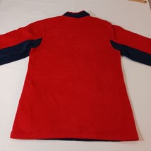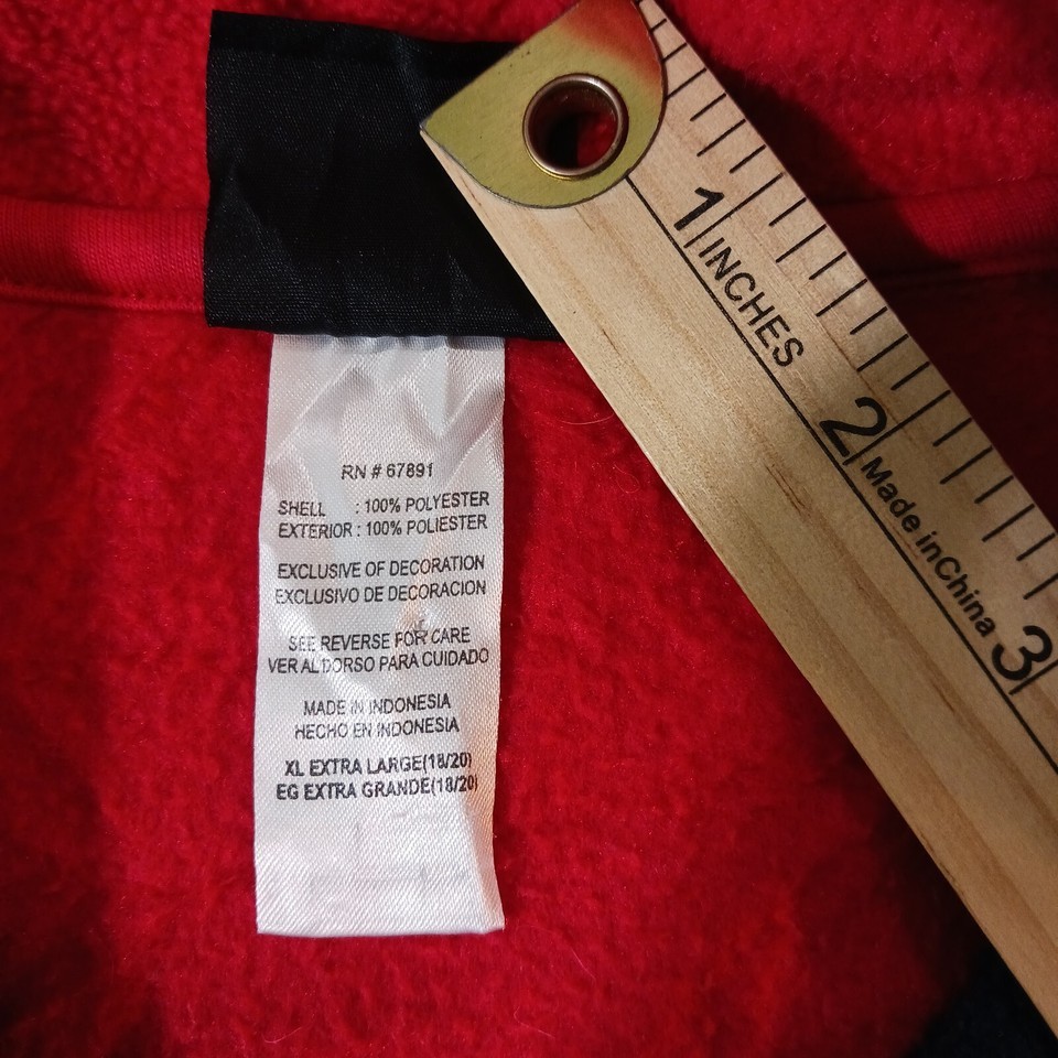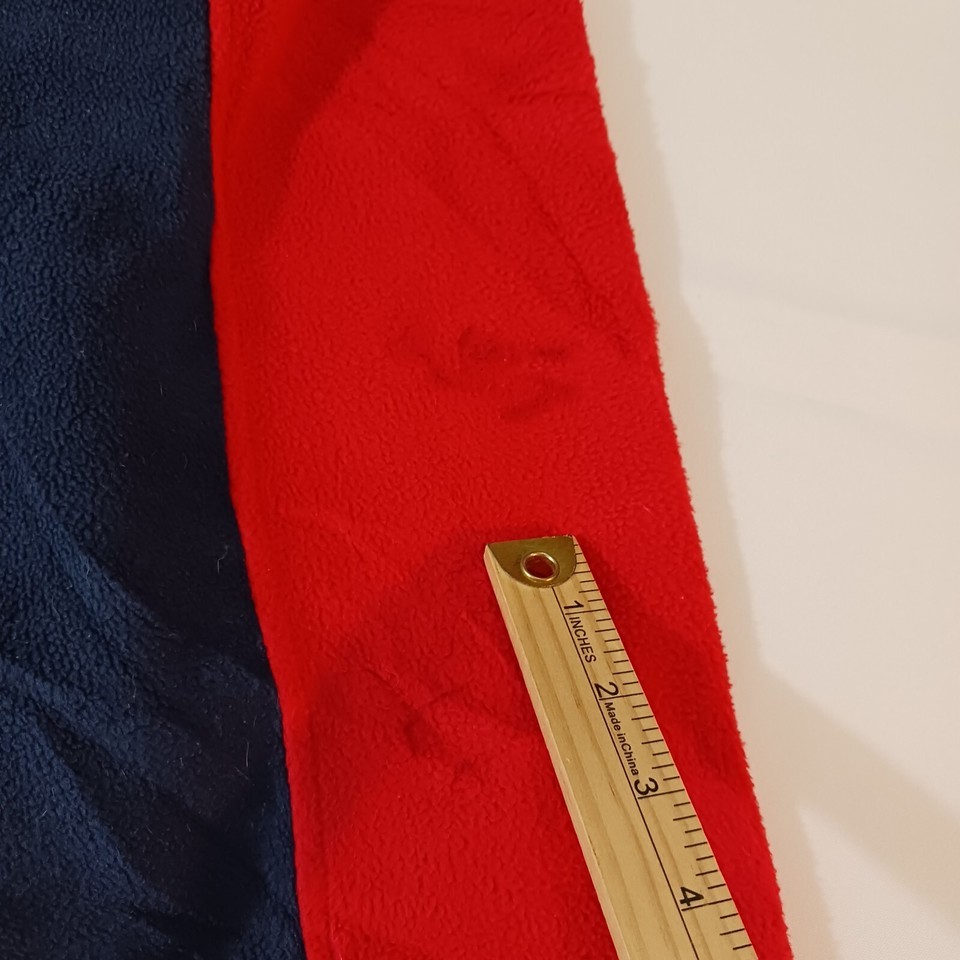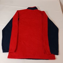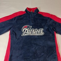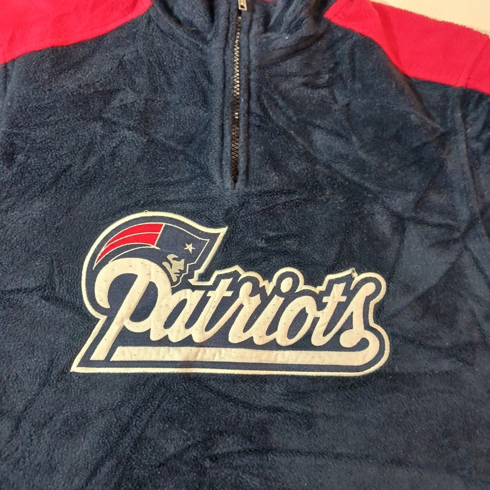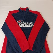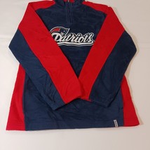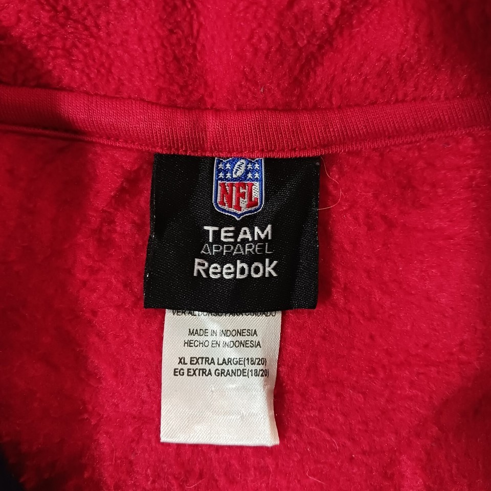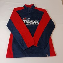 This is a Reebok youth XL pullover sweatshirt from the Team Reebok Apparel line, featuring a patriotic theme with New England Patriots colors of blue and red. The sweatshirt is made of polyester fleece fabric, with long sleeves and a chest size of 39 inches. The design is suitable for boys and is a comfortable and warm addition to their wardrobe. Made in Indonesia, this sweatshirt is a stylish choice for young Patriots fans looking to show their team spirit.