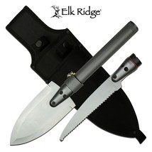 Introducing the Elk Ridge Survival Multi Function Tool. Featuring a 7 inch stainless steel spear blade entrenching tool with an interchangeable saw blade. The 8.5 inch gray anodized aluminum handle contains a survival kit and compass and all of it fits neatly and securely into a nylon sheath that can be worn on your belt ensuring that it is always by your side. Tackle brush, dig holes, saw fire wood, you name it, this tool does it all. Interchangeable saw and shovel both constructed from 3Cr13 stainless steel with a satin finish. Anodized aluminum handle with survival kit stored inside, also comes with a nylon sheath for easy transportation.