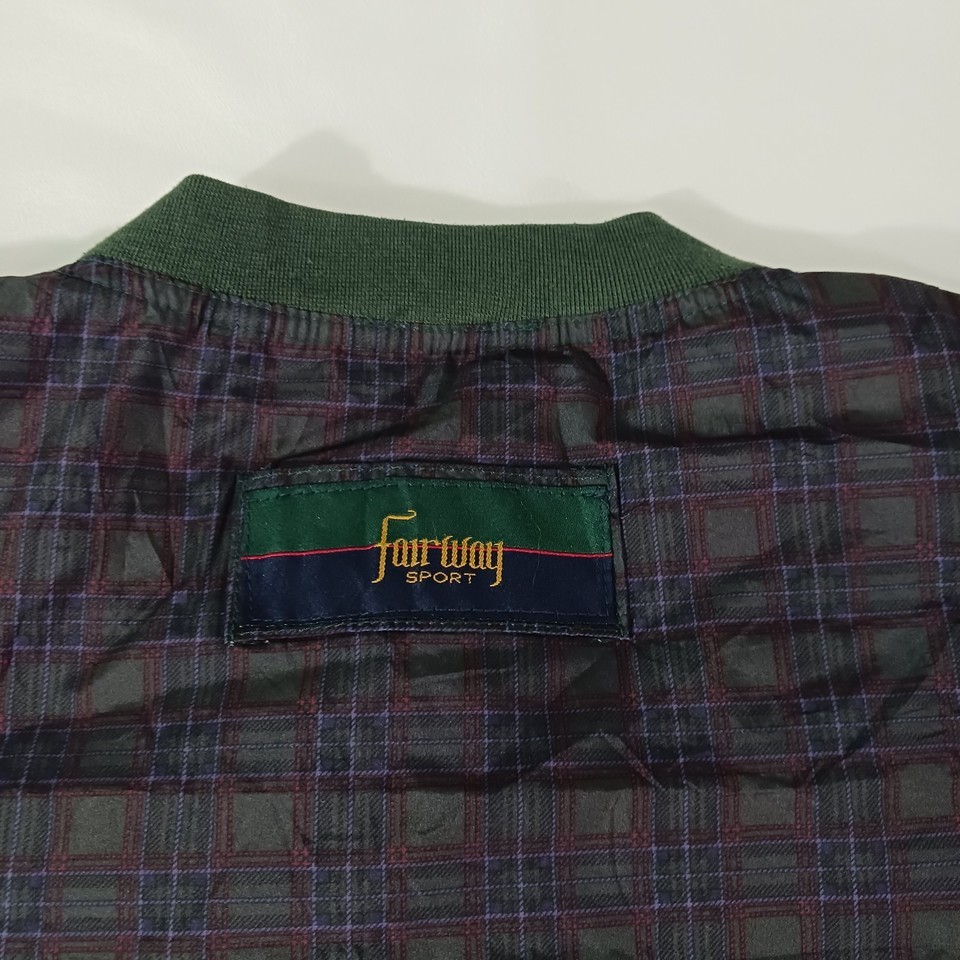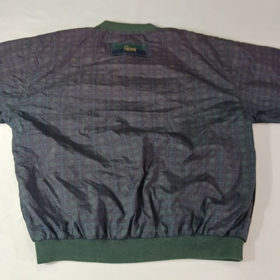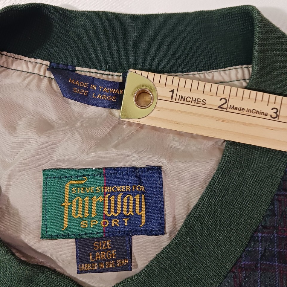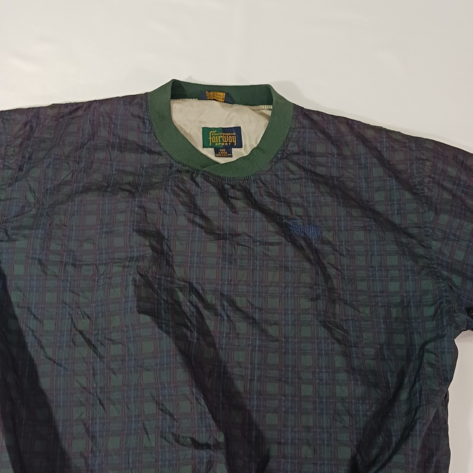 This Fairway Sport men's windbreaker jacket is a vintage-inspired piece featuring a blue and green tartan plaid pattern. Made from 100% polyester, it has a pullover closure with a band collar and long sleeves. The lightweight and breathable design makes it suitable for all seasons, and it is lined with polyester for added comfort. With a classic fit and size L, this limited edition jacket is ideal for outdoor activities like golf and casual wear, showcasing a retro 80s and 90s vibe with designer accents and a nostalgic logo.