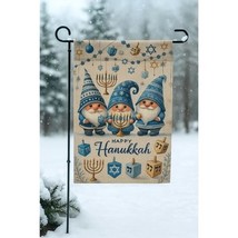 Celebrate the Festival of Lights with this adorable Hanukkah garden flag! Featuring three cheerful gnomes in cozy blue hats surrounded by menorahs, dreidels, and Stars of David, this flag adds warmth and festive charm to your outdoor decor.