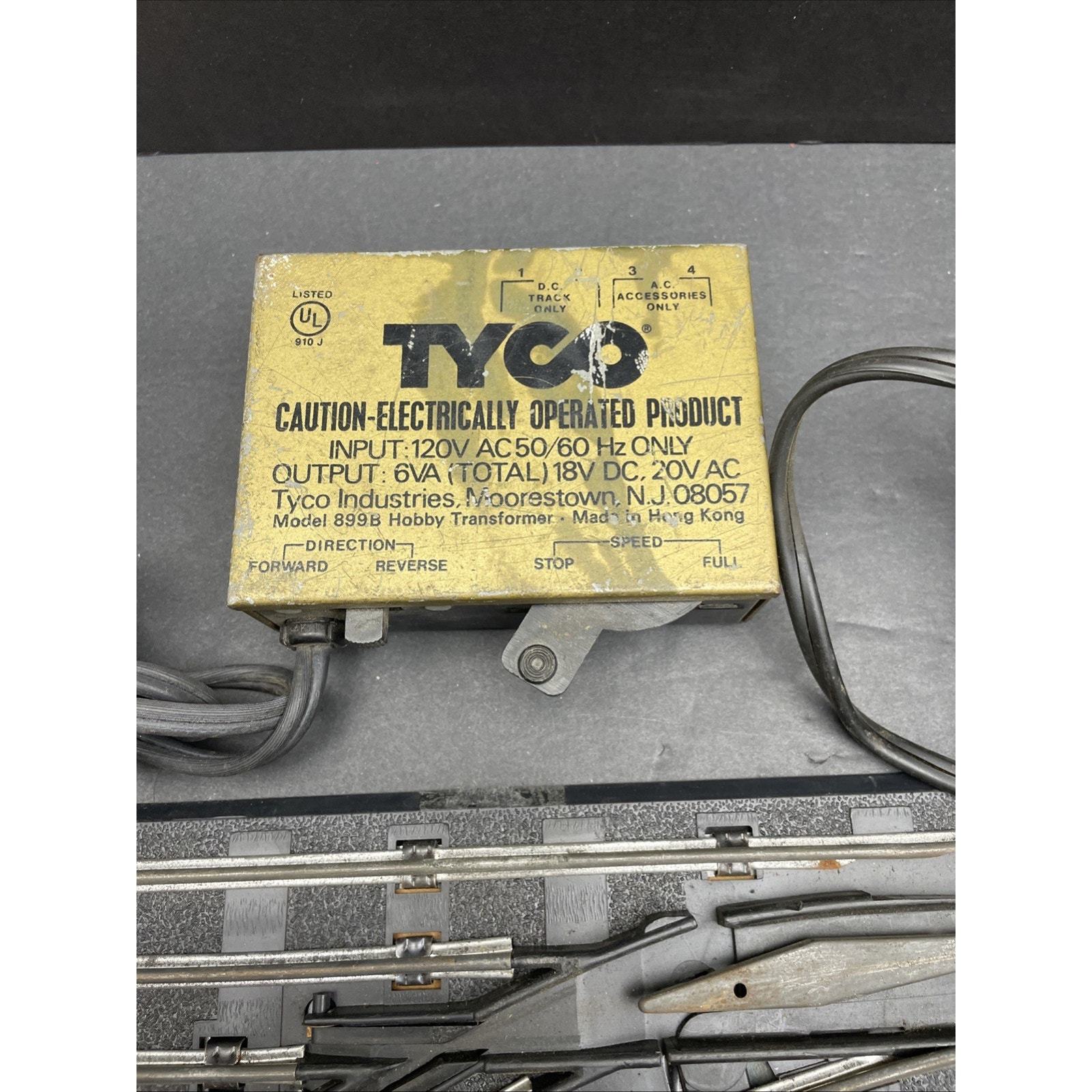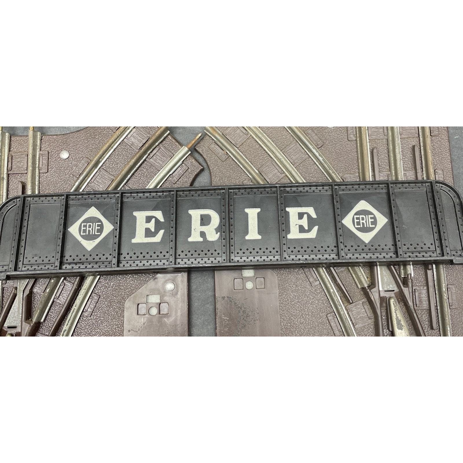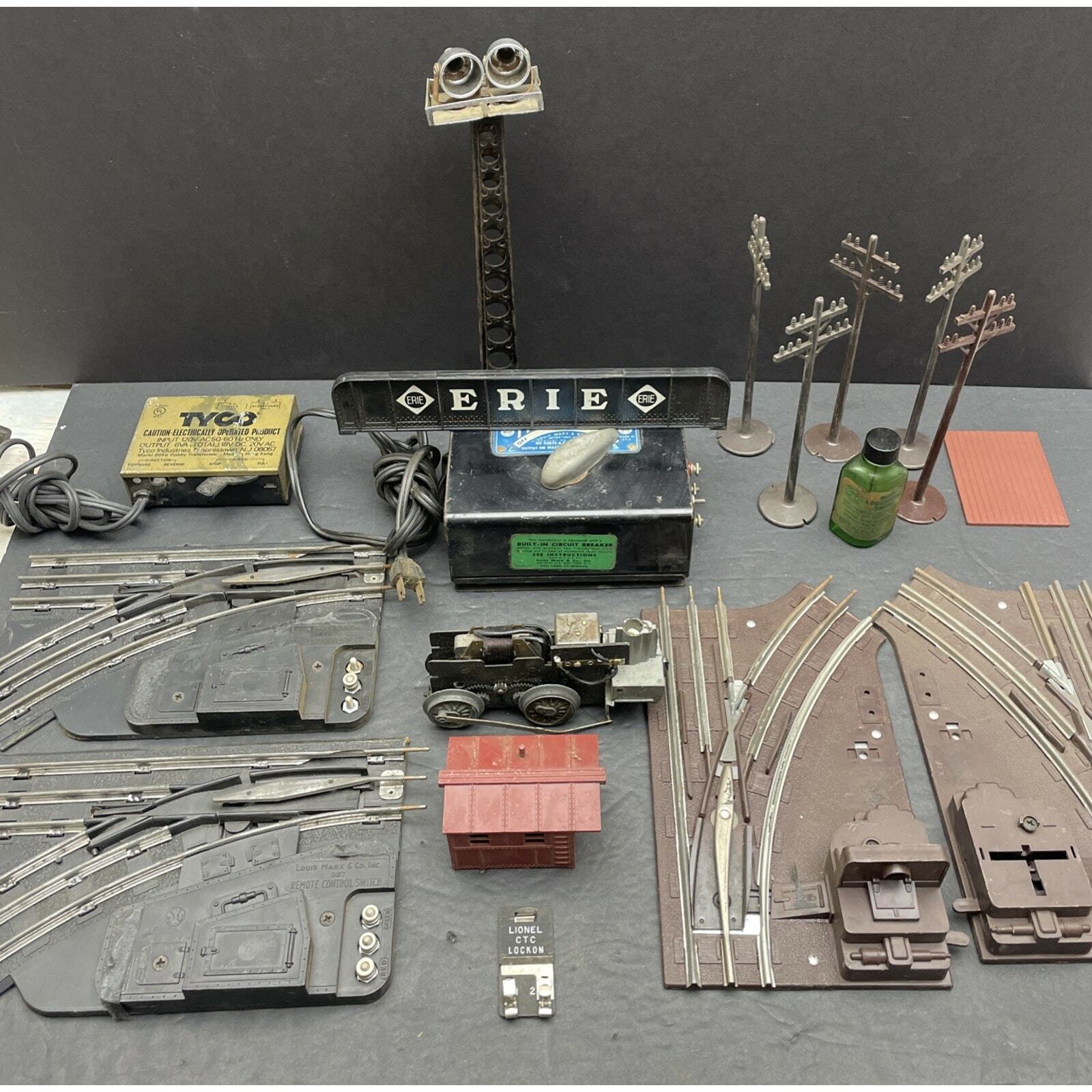 This vintage lot of train track accessories includes a great mix of Lionel and Marx model train components, perfect for collectors or hobbyists restoring layouts. The lot includes switcher tracks, a working power source, a light tower, several telegraph poles, ERIE sign, a train car, and various track sections.