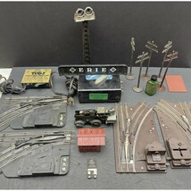 Vintage model train accessories, Lionel train parts, Marx train track lot, switch tracks, vintage power pack, telegraph poles, train light tower, O gauge track pieces, Erie sign, Lionel OTC Lockon, hobby train repair lot, vintage model railroading