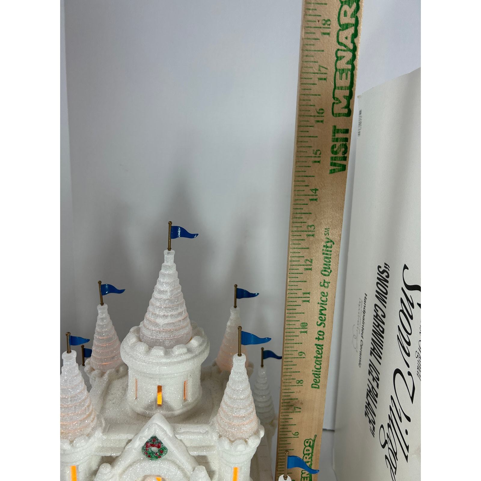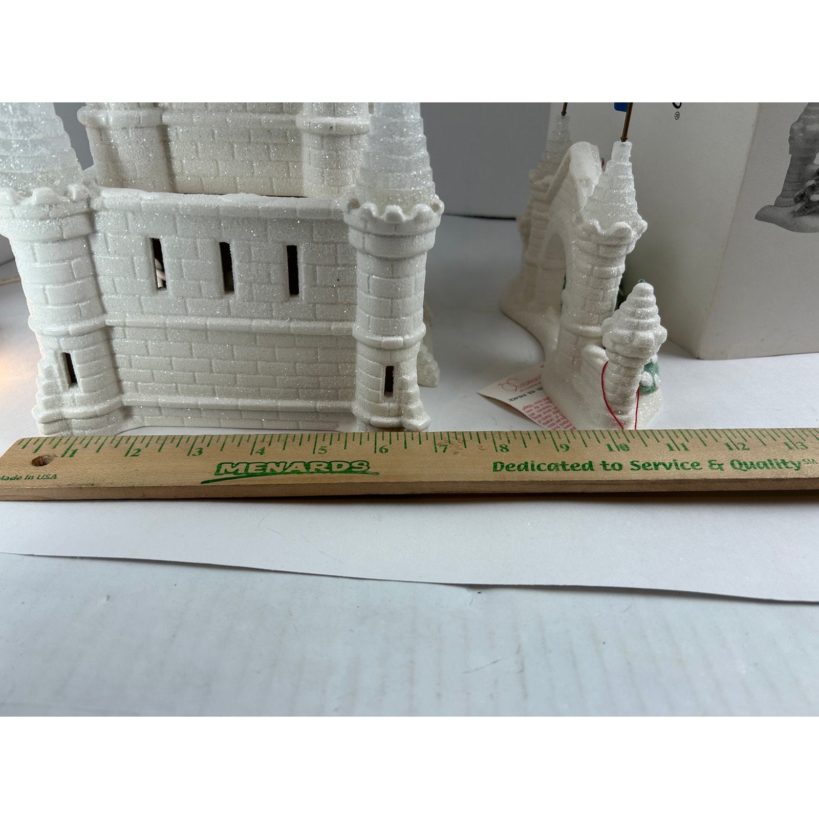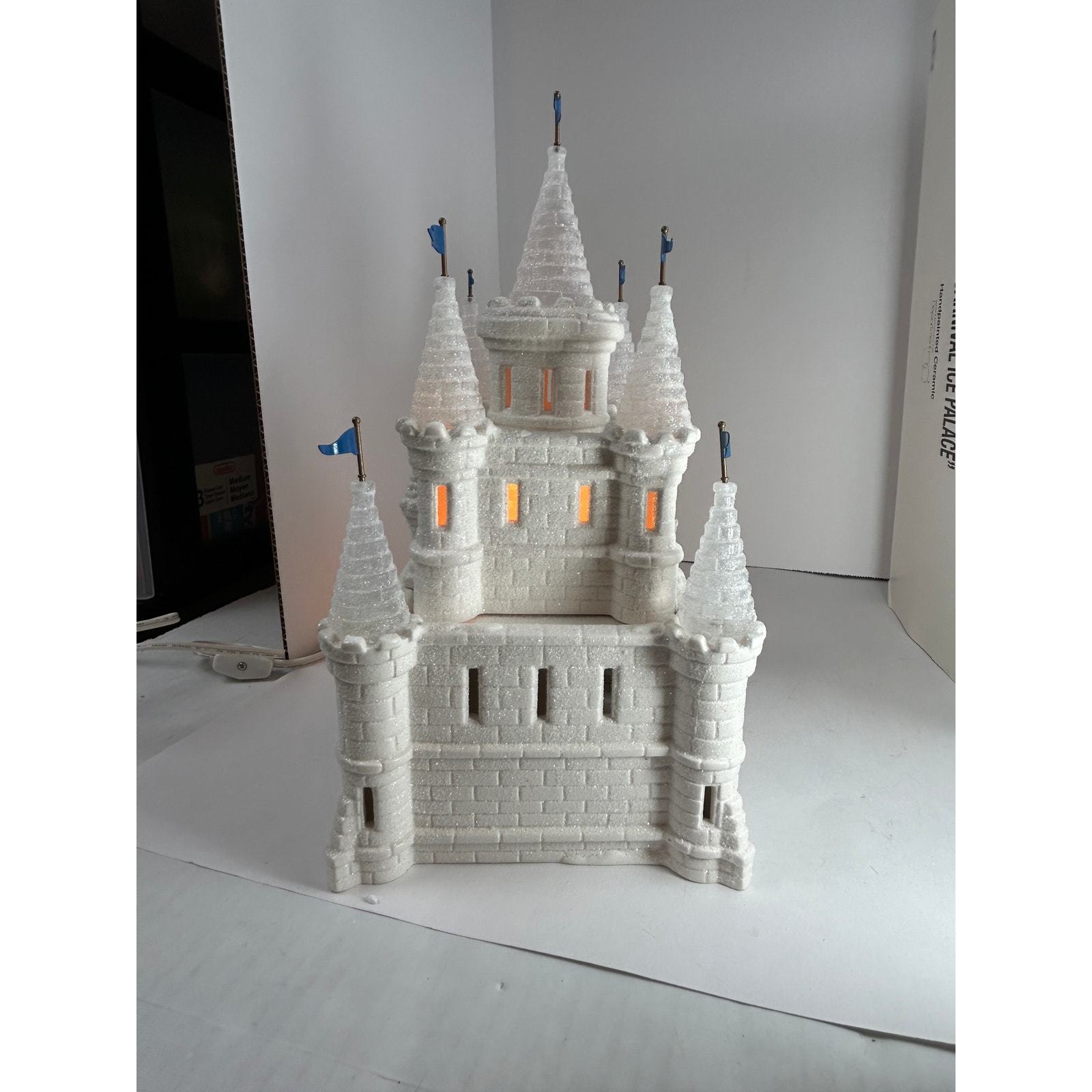 This highly detailed lighted castle features shimmering ?ice? texture, blue flags, and Santa visible through the lit window. Includes working light cord, original box, and hang tag.