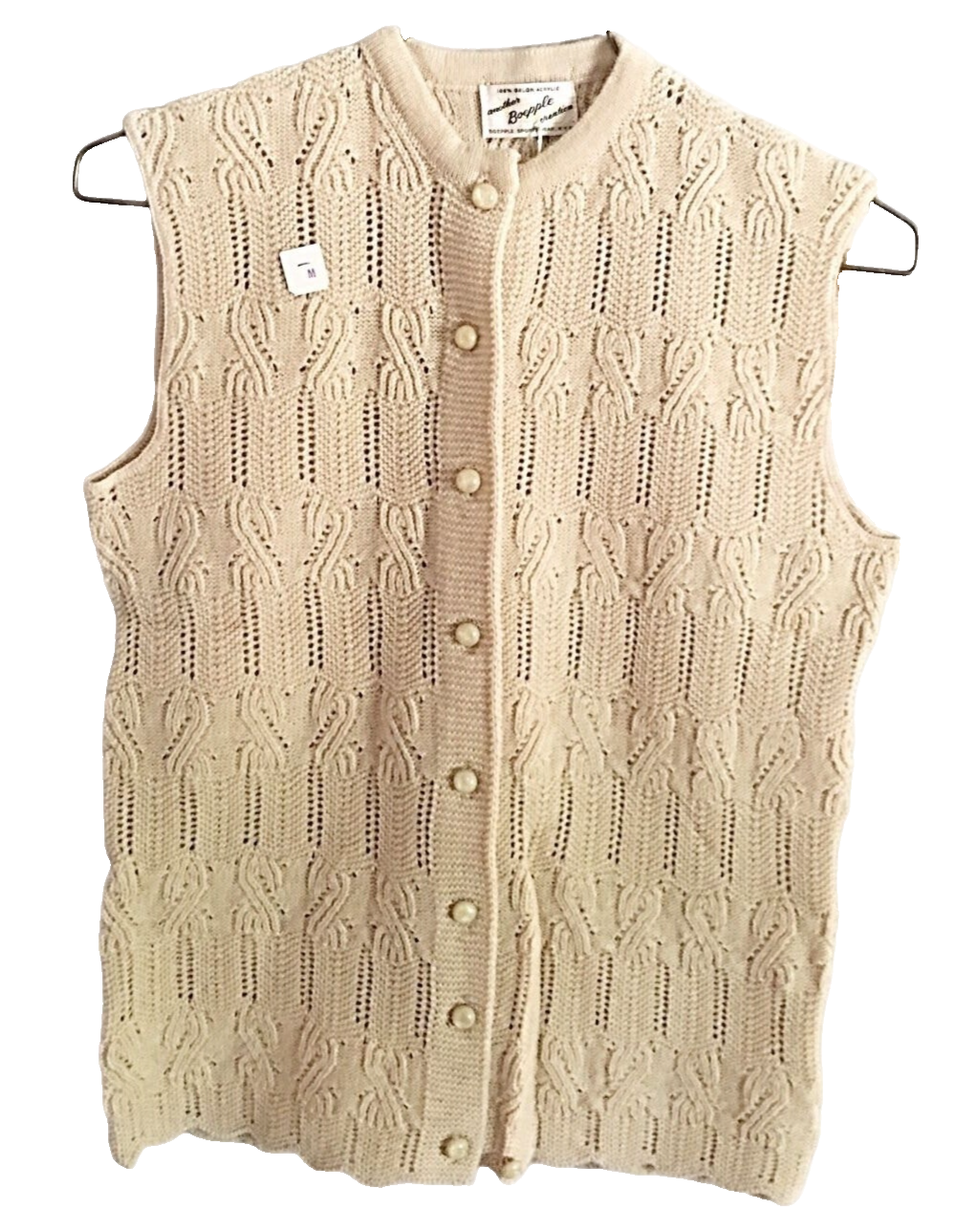 Vintage 1960s Boepple Sportswear knit vest in beige ivory Orlon acrylic. Sleeveless button-down style with unique textured knit pattern and eight matching buttons (plus spare). A versatile layering piece that works from mod retro to modern styling.