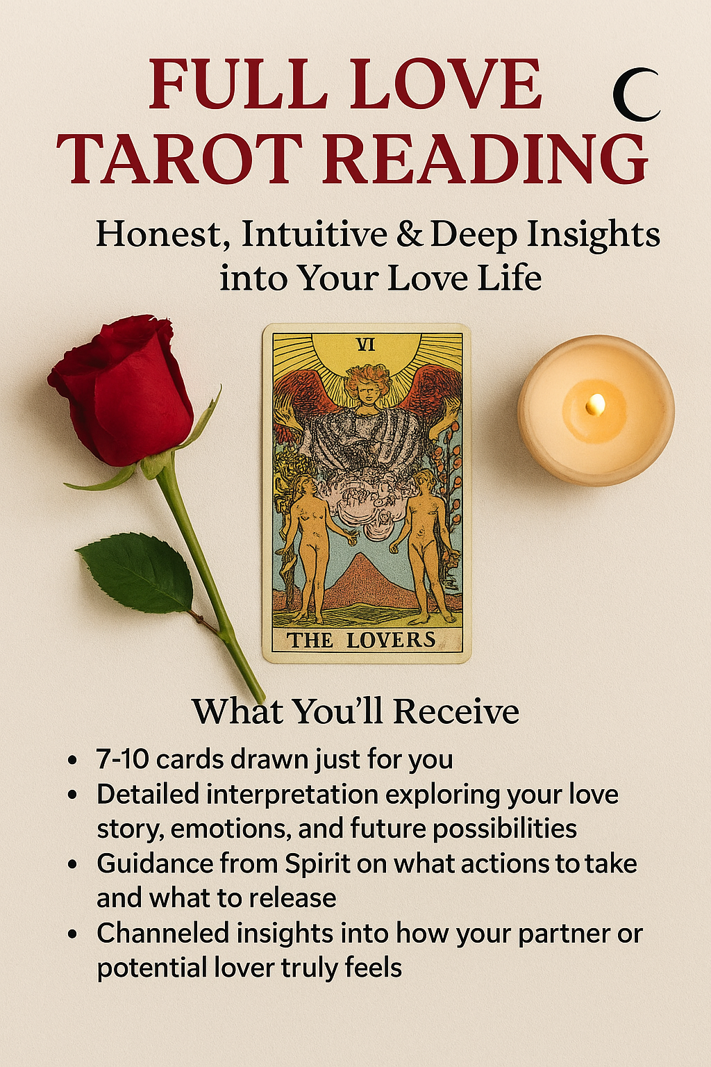 This Full Love Tarot Reading (7–10 cards) is designed to reveal the truth behind your romantic path — the energy between you and your person, the obstacles in love, and the future that awaits.