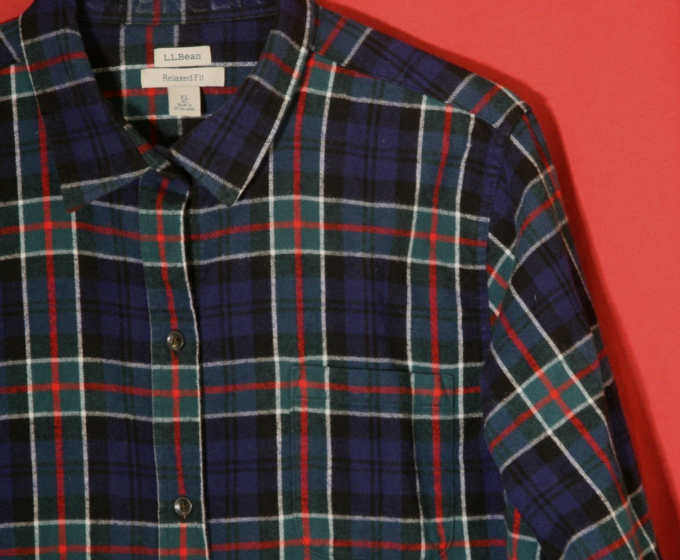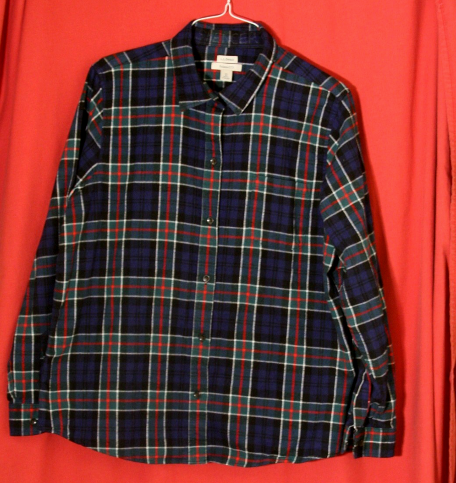 Description: Men's flannel shirt, 100% Cotton, button front shirt, patch pocket on left chest, 2 button cuff, long sleeve, plaid pattern. There is a name printed on the inside back collar