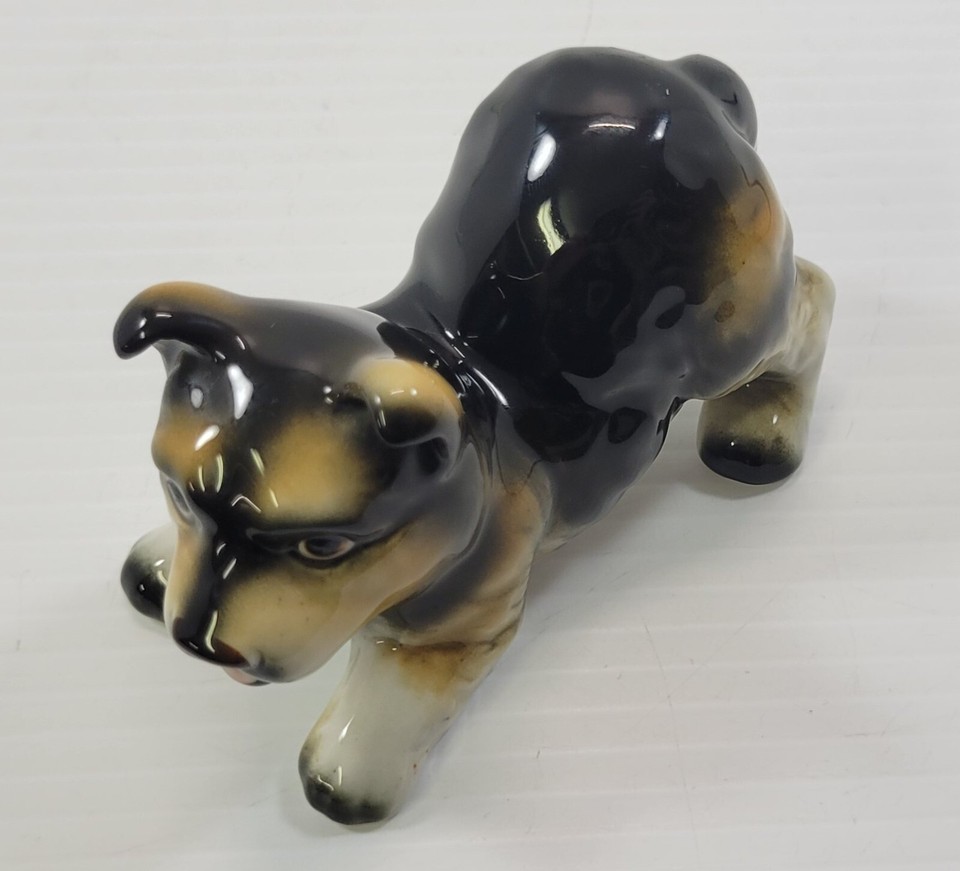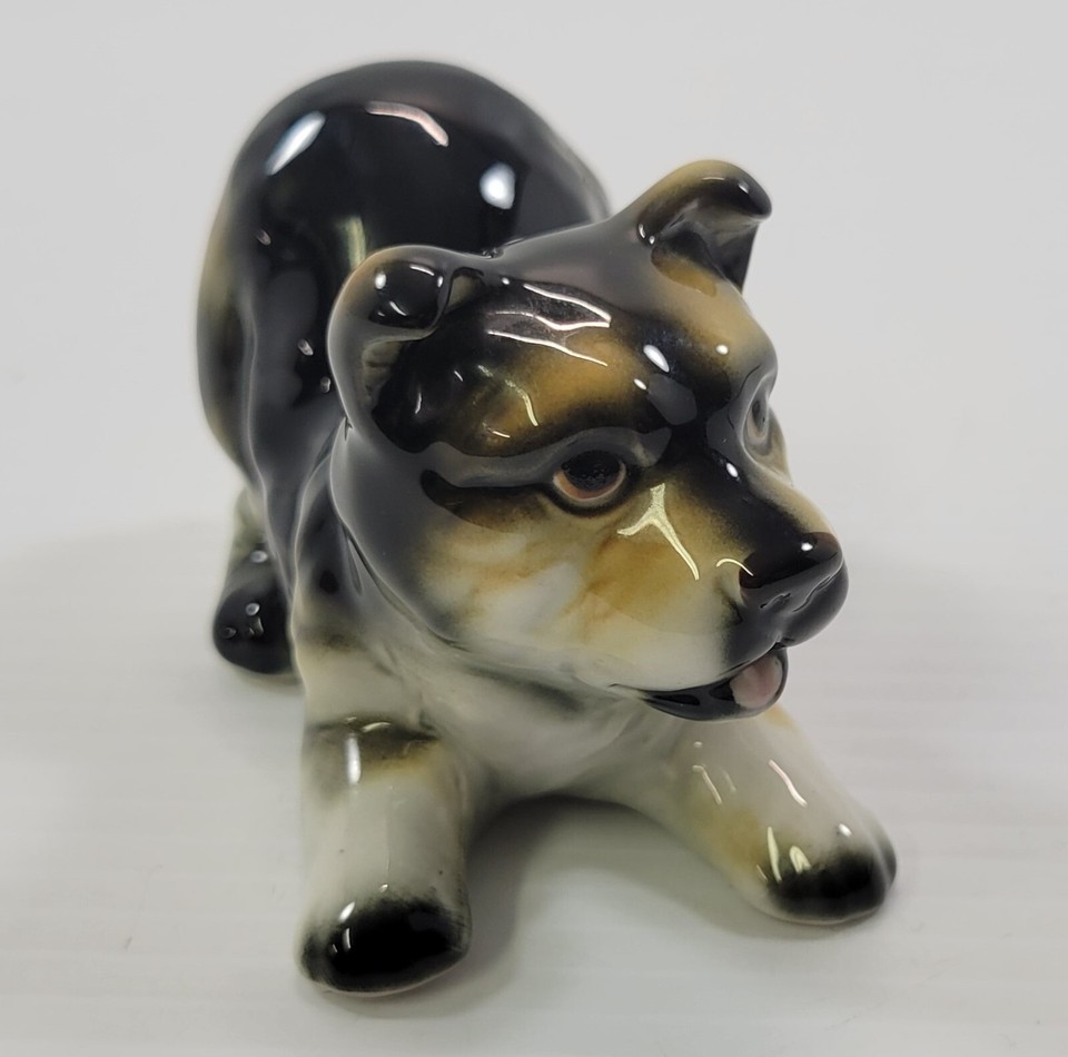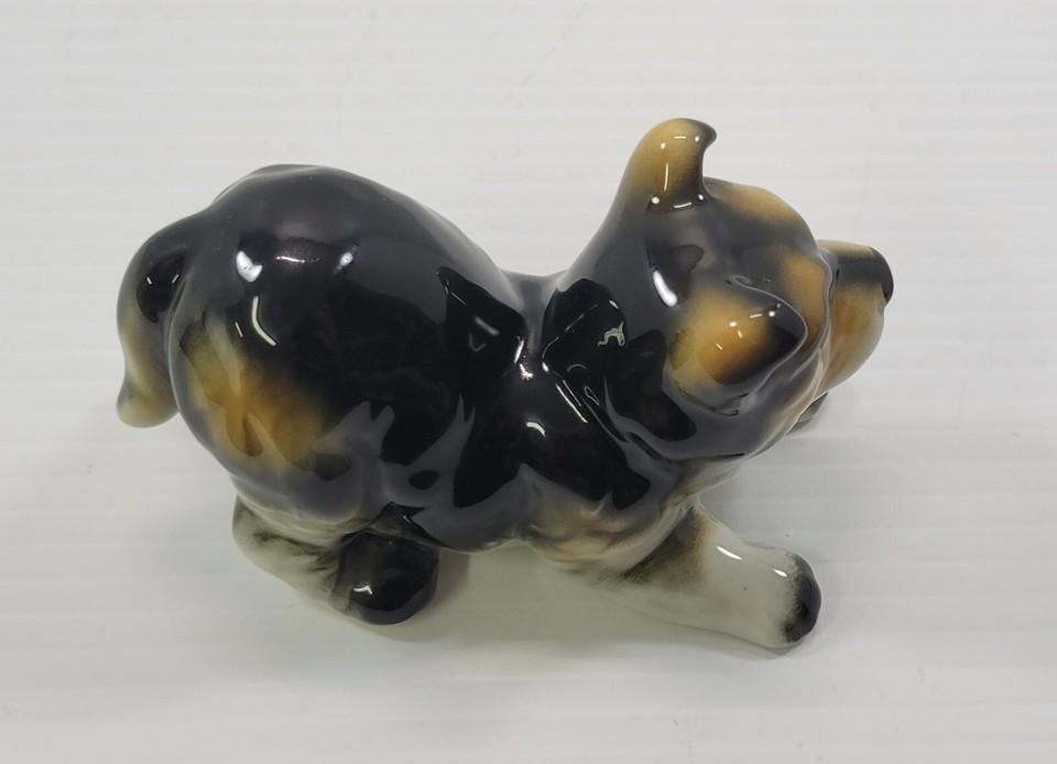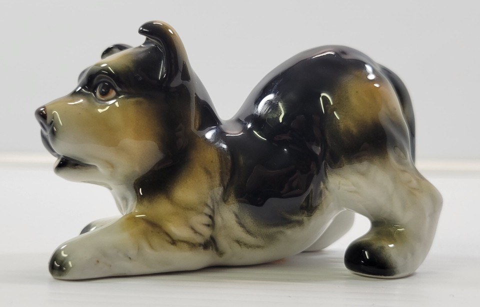 Vintage Lefton Black Brown Collie Terrier Playful Puppy Dog Porcelain Figurine