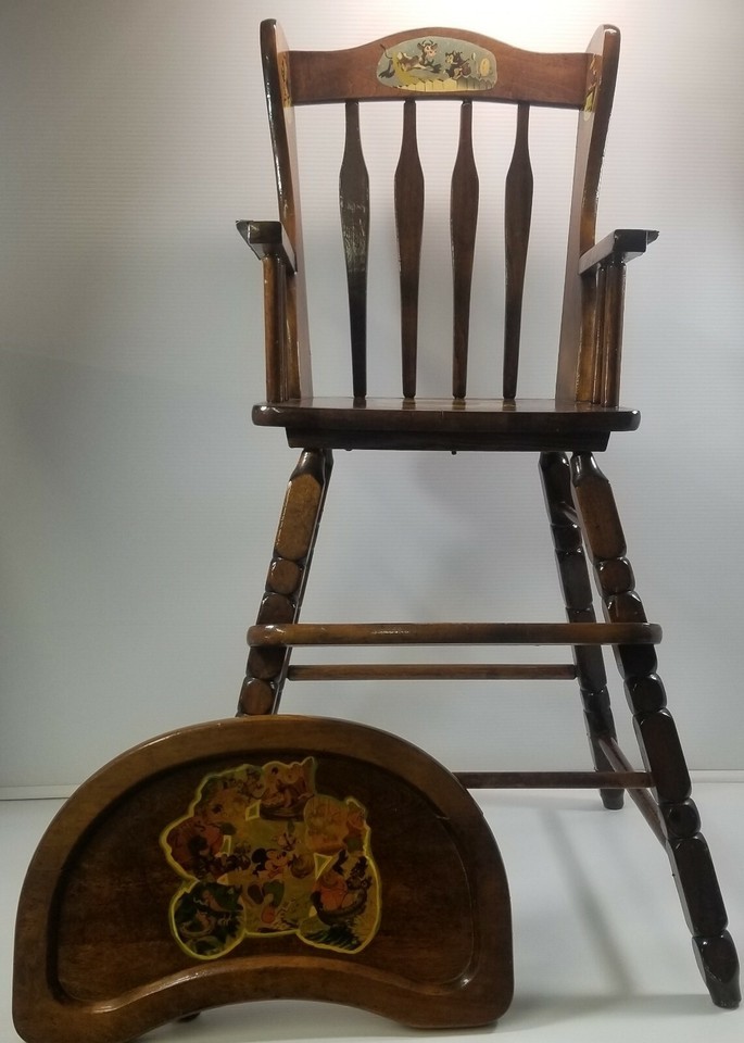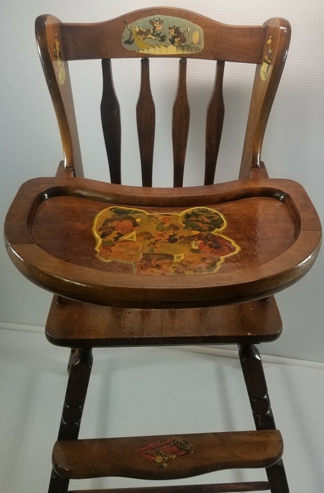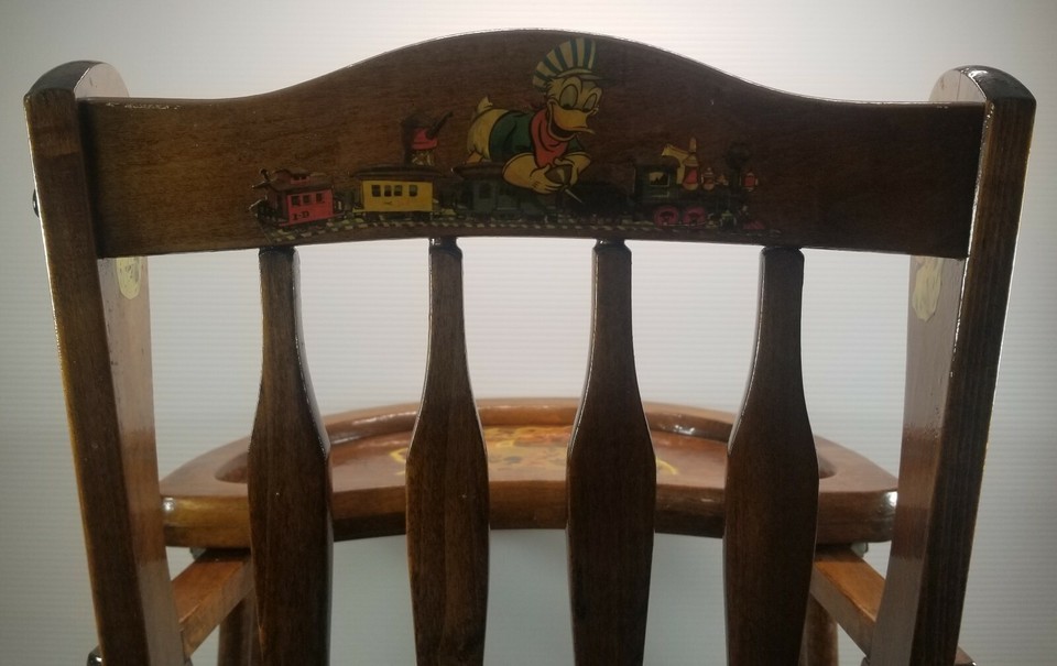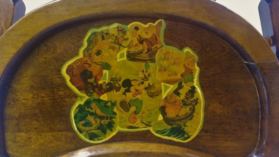 Chair appears to have an old DIY restoration/finish to it with Disney/fairytale stickers sealed with a glossy clear coat: Mickey Mouse, Three Little Pigs, Snow White and the Seven Dwarfs, Donald Duck, etc.