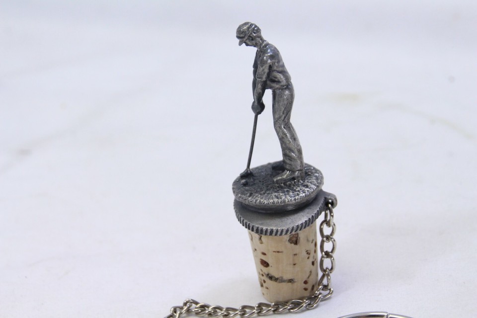 VINTAGE PEWTER GOLFER GOLF PLAYER CORK WINE BOTTLE STOPPER WITH CHAIN