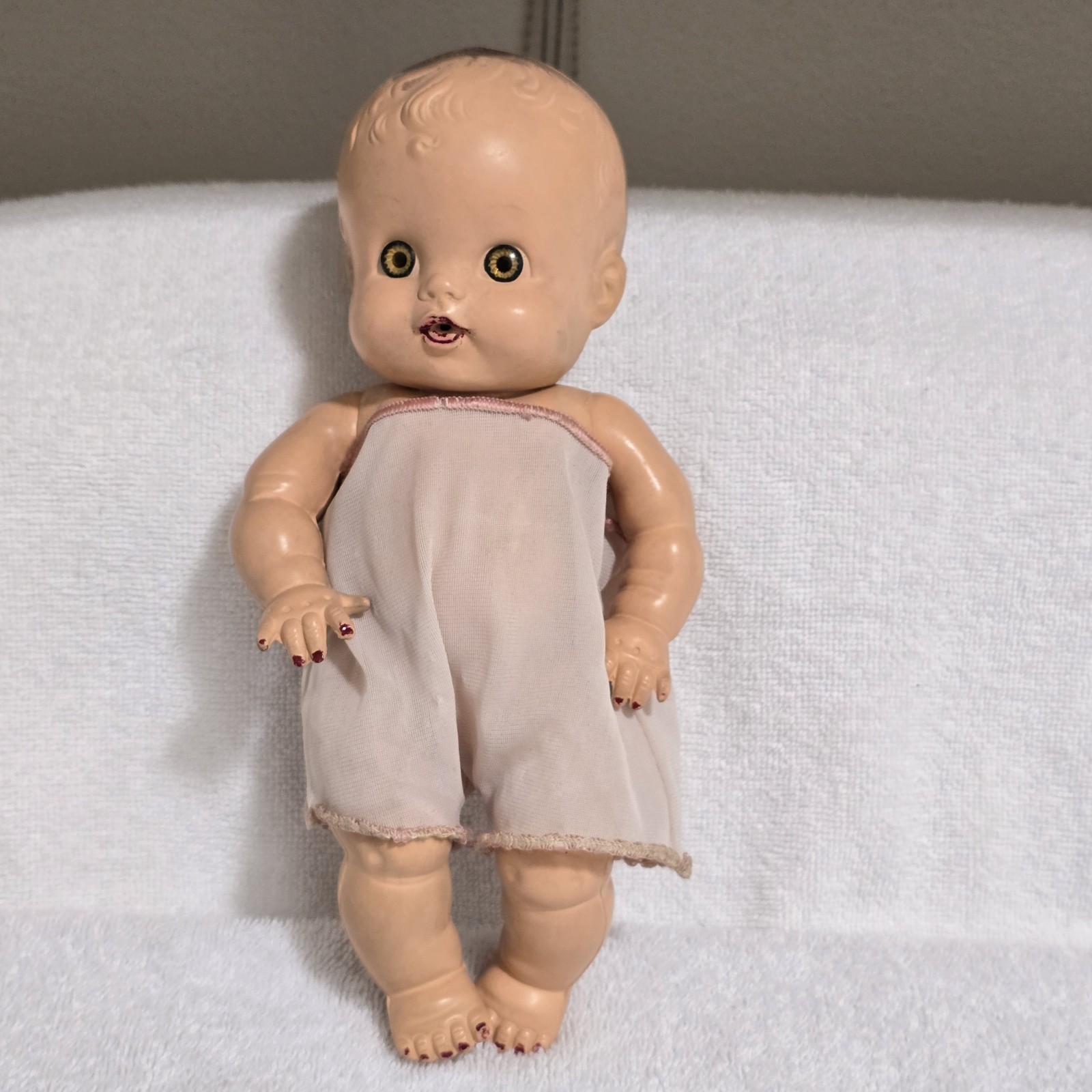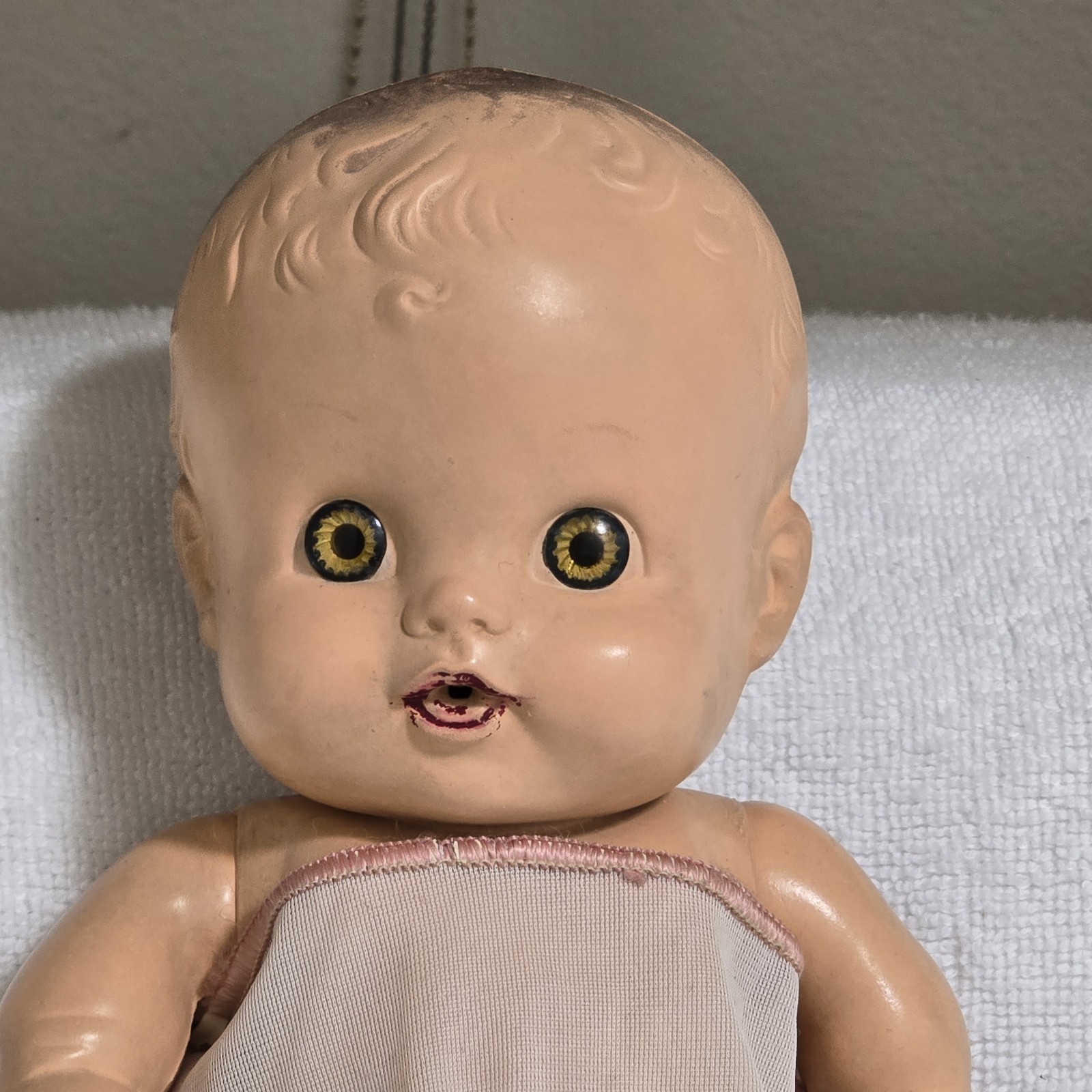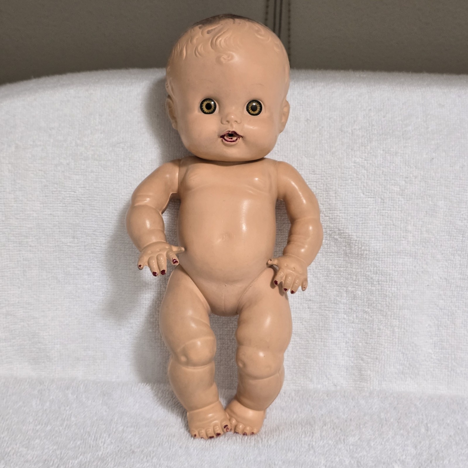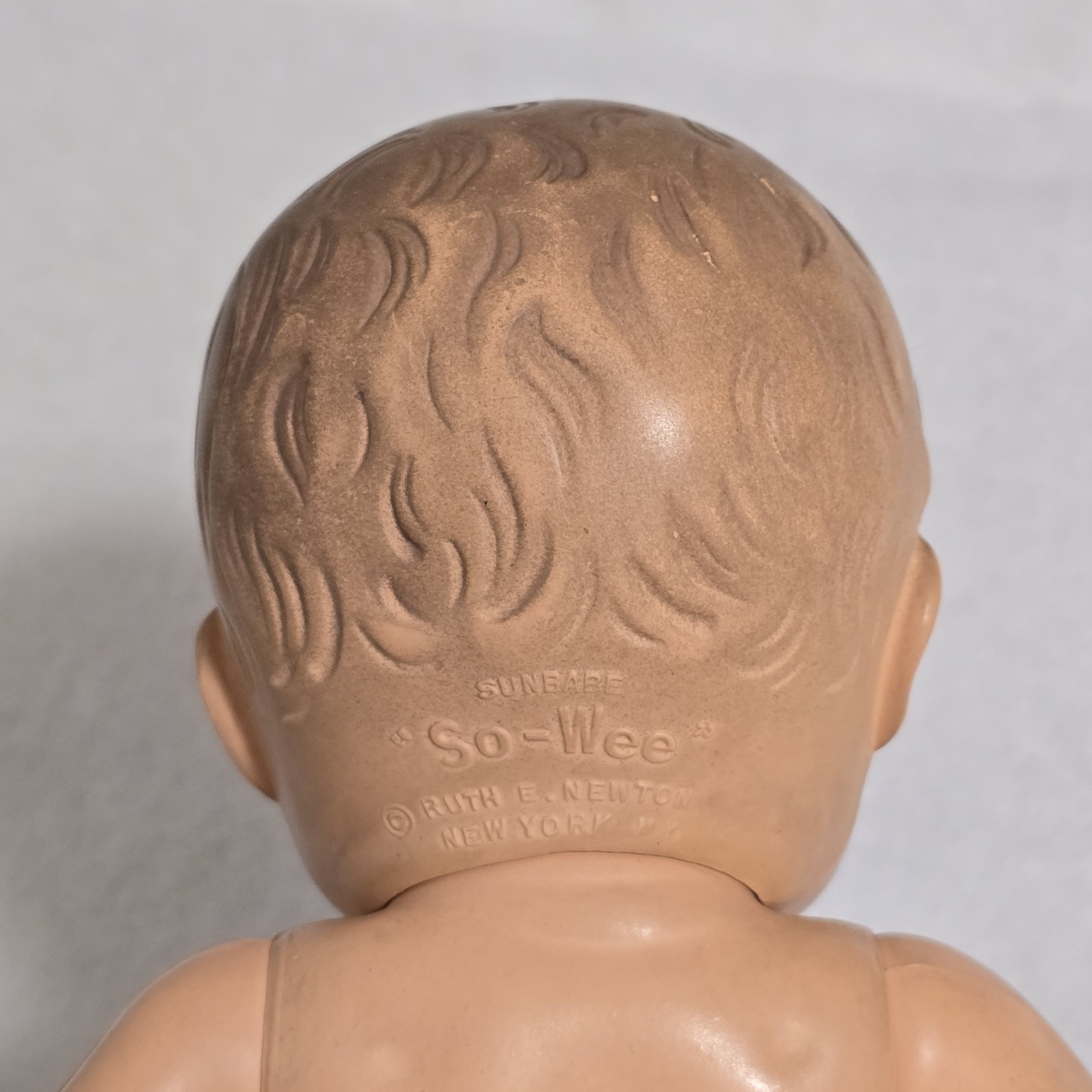 This vintage 10-inch rubber doll is a rare find for collectors and enthusiasts. With beautiful brown curly hair and a light complexion, this original Sun Rubber "So-Wee" doll from 1950 is in good shape for its age.