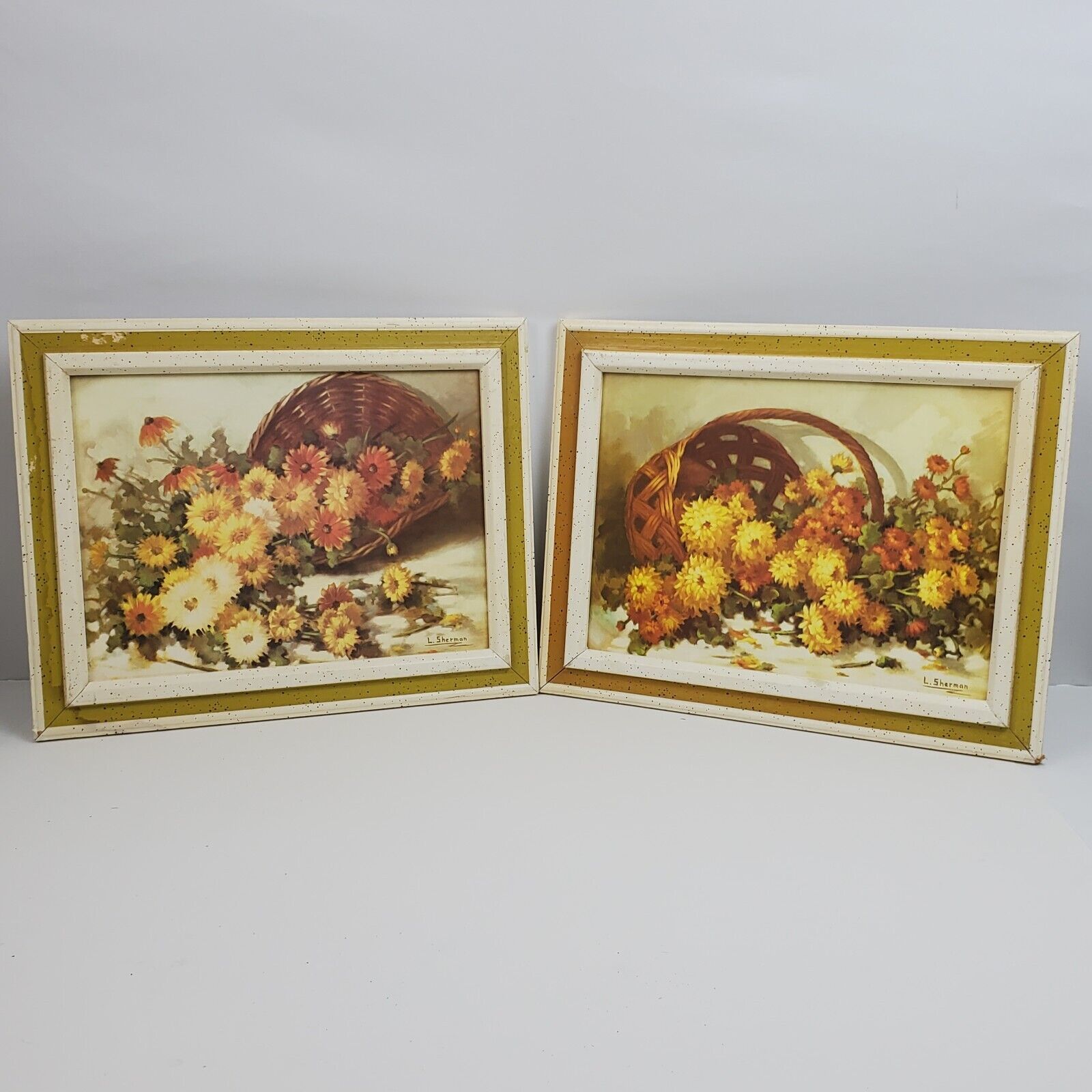 Vintage L Sherman Flower Print ART In Wood Frame 14.5x11.5 Inch SET OF 2