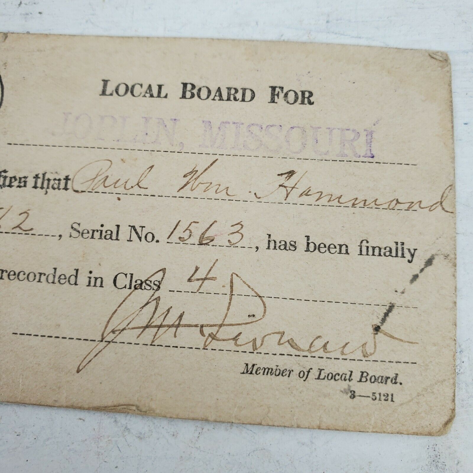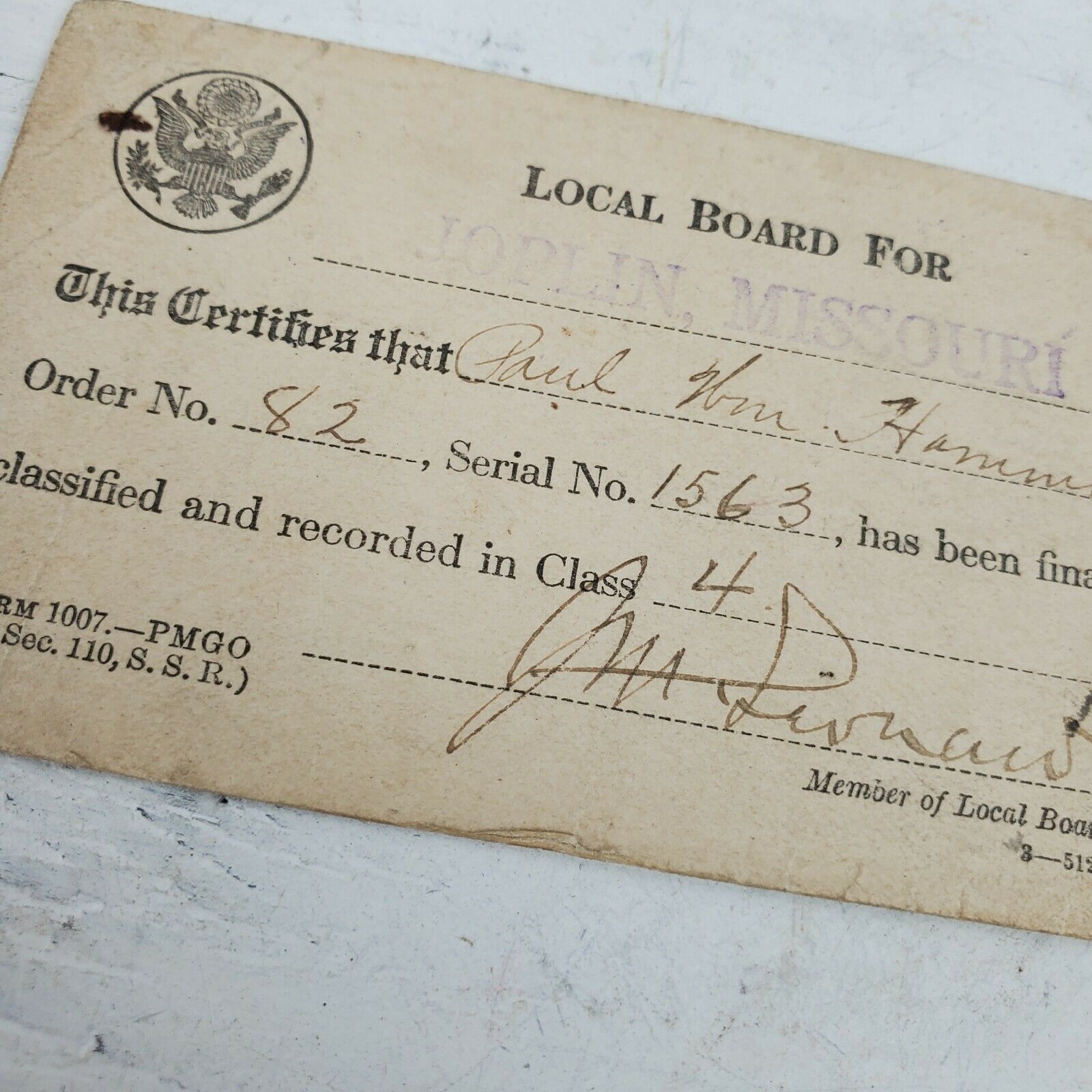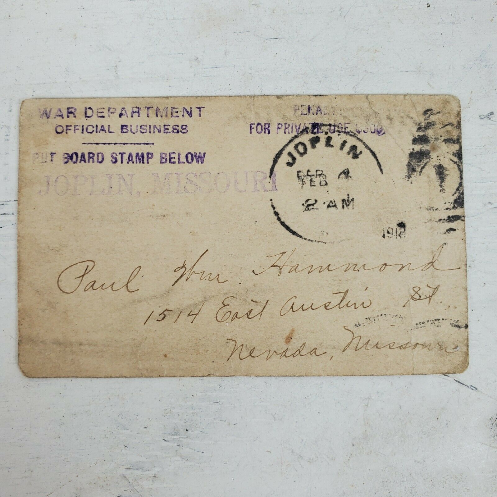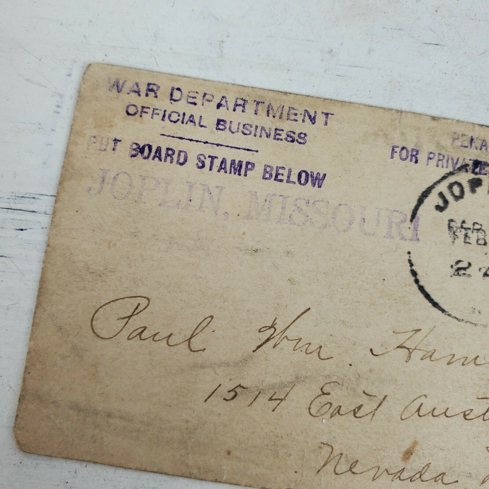 Antique 1918 Form 1007 PMGO War Department Joplin Missouri Military Card