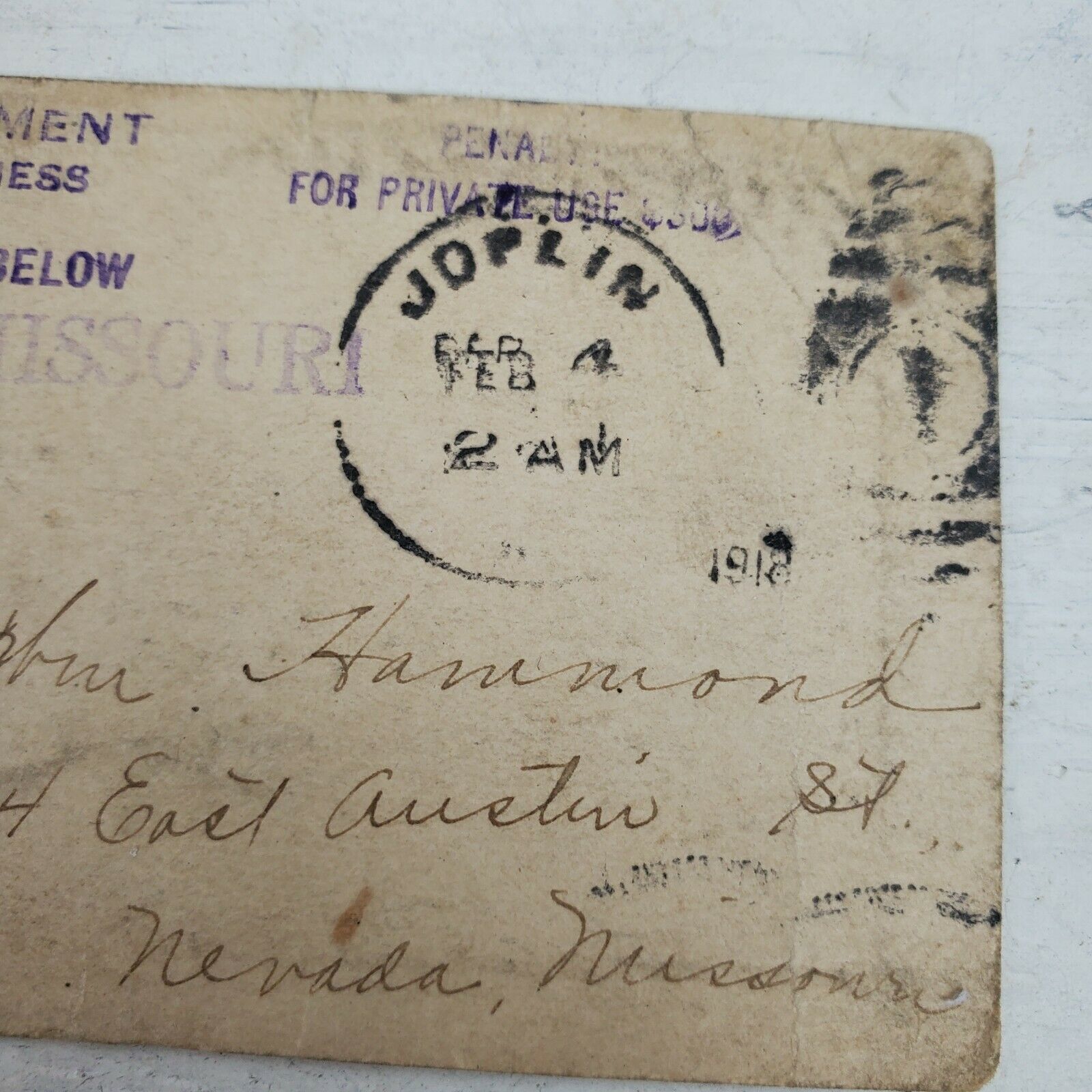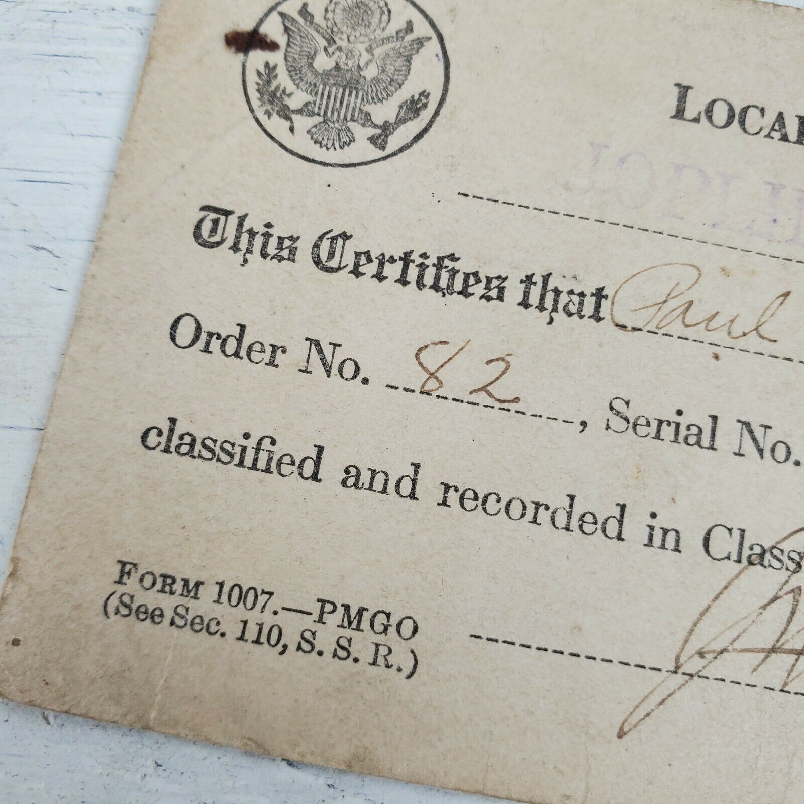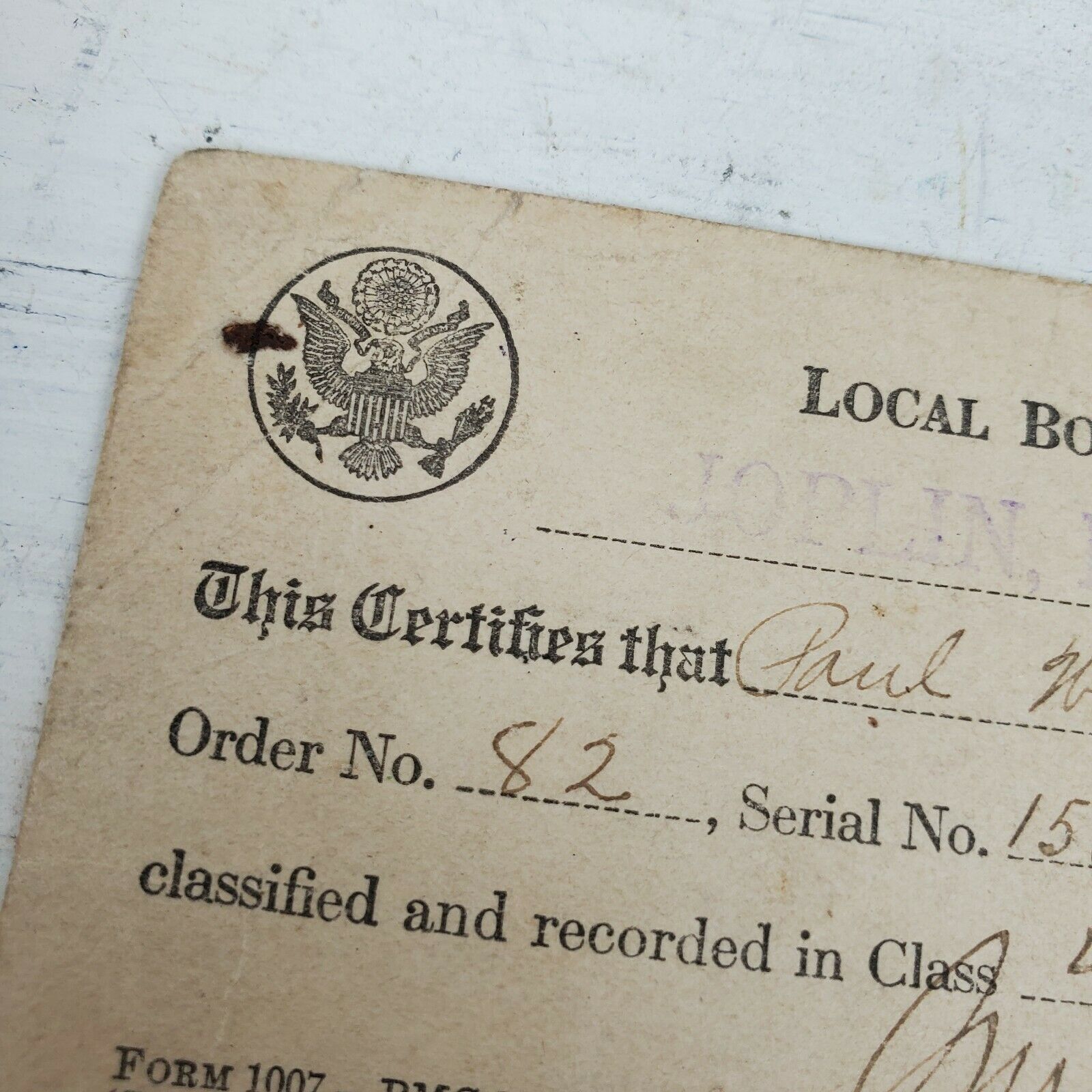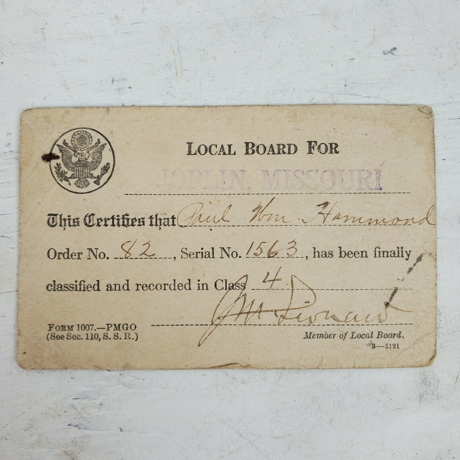 Antique 1918 Form 1007 PMGO War Department Joplin Missouri Military Card