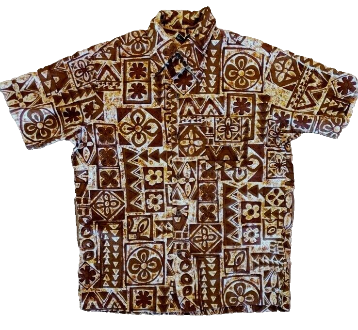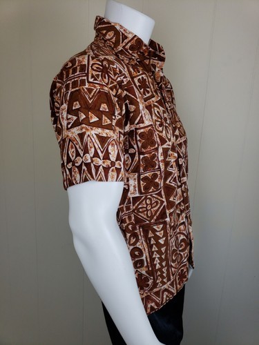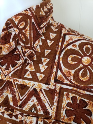 Vtg Barkcloth Tapa Print Shirt Mens L 60s Dagger Collar Hawaiian Tiki Brown USA