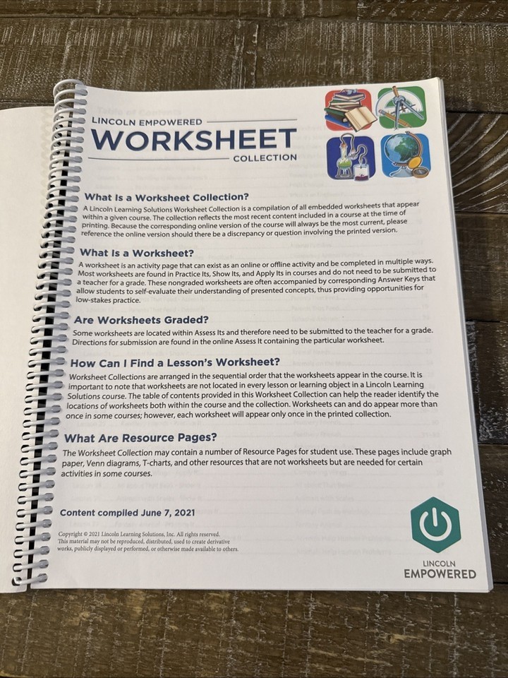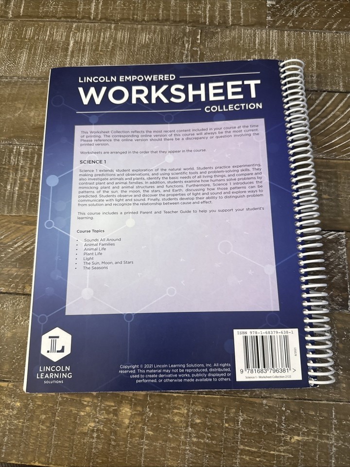 The Lincoln Learning Science 1 Worksheet Collection is a spiral-bound textbook published by Lincoln Learning in 2018. It is a comprehensive educational resource focusing on science concepts presented in an easy-to-understand language. The collection includes a variety of worksheets designed by Lincoln Learning Solutions, providing students with engaging and informative learning materials in the subject area of education. With a general focus on science, this textbook is a valuable tool for students looking to expand their knowledge and understanding of scientific principles.