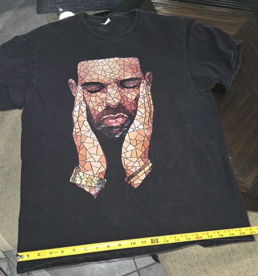 The product is a Men's Large Canvas Black Stained Glass Drake Graphic T-Shirt from Bella + Canvas. It is a regular fit T-shirt with short sleeves, made of high-quality canvas fabric in a solid black color. The shirt features a unique stained glass design of a drake, making it a stylish and eye-catching addition to any man's wardrobe. With its comfortable size and quality construction, this T-shirt is perfect for casual wear or as a statement piece for fans of the brand or design.