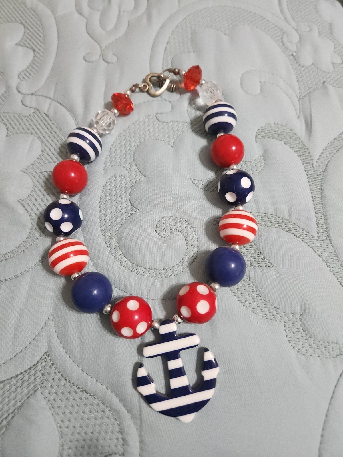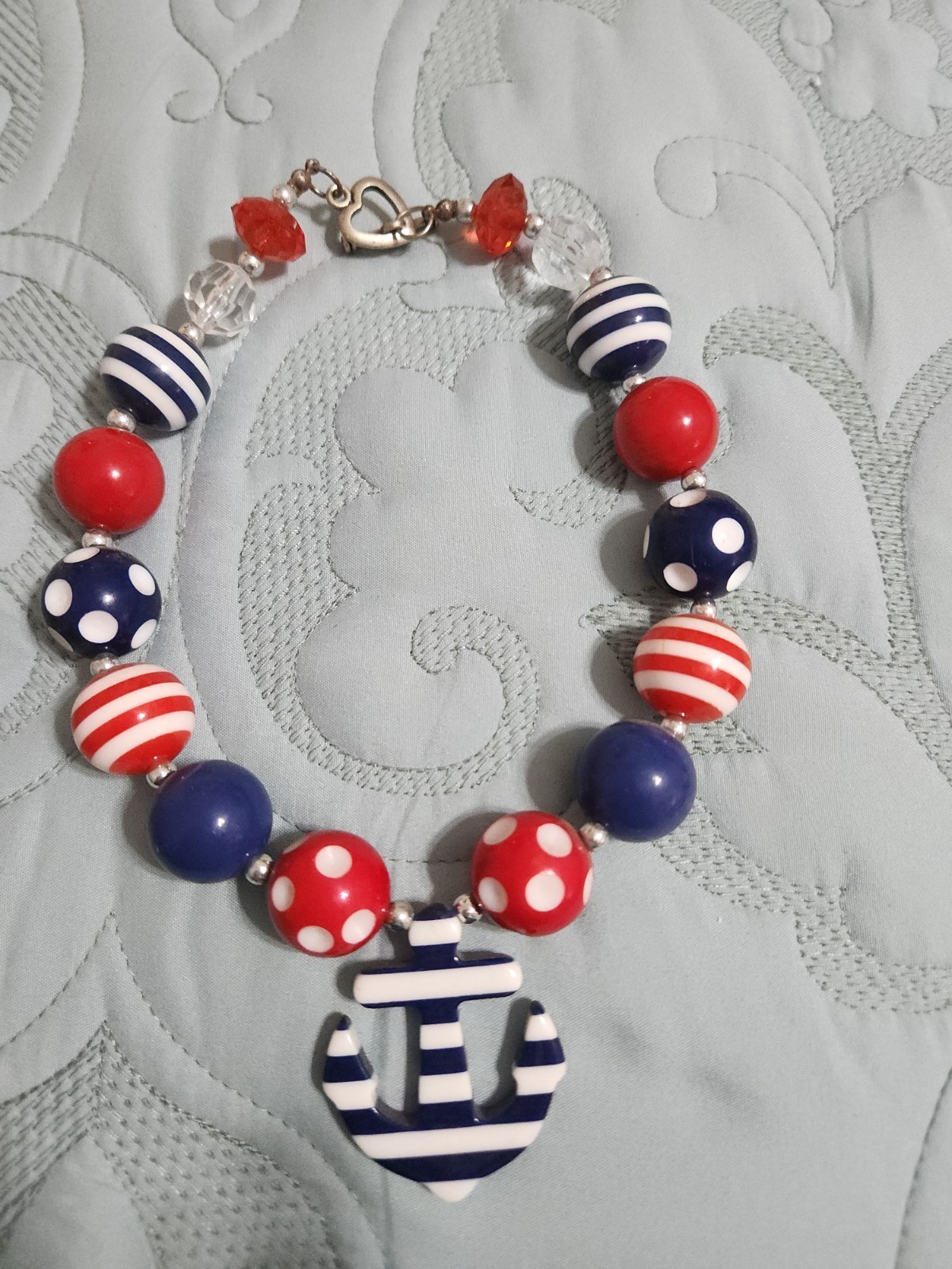 Girls Patriotic Bubblegum Necklace Chunky Beads Kids Jewelry W/ Ship Anchor