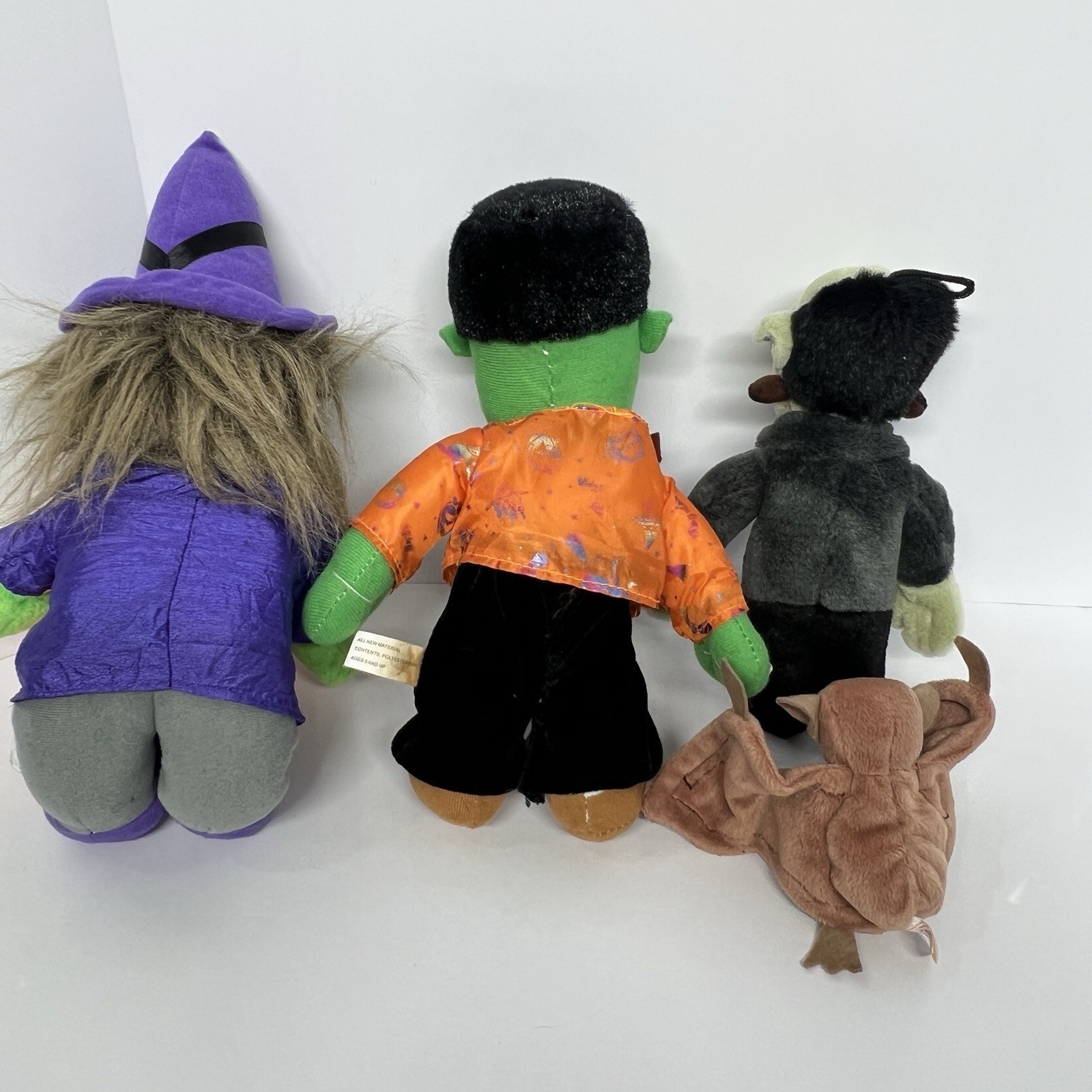 The product is a lot of four vintage Halloween plush items, including a Ty Batty Beanie Baby and a K K Witch Frankenstein decoration. These items are collectible and Perfect for adding a spooky touch to your Halloween decor, these plush toys are fun and nostalgic for collectors