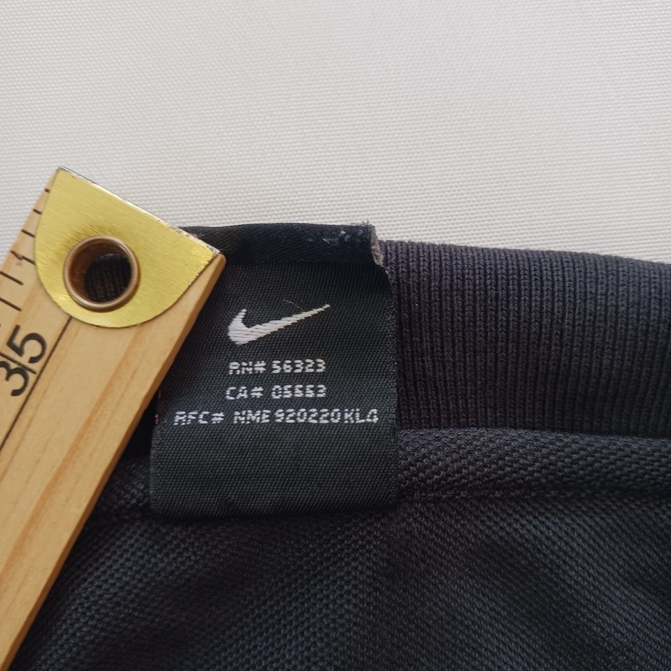 The Vintage Nike Team Dri Fit 2-Button Men's Black Polo Shirt is a pre-owned, short-sleeved collared shirt with a pullover closure. It is a regular fit polo with contrasting trim and is made of solid black fabric. The shirt is a size 2XL and is part of the Nike Team Apparel product line. It has no graphic print and is not specified to be slim fit. The shirt was made in Thailand and is a vintage item.