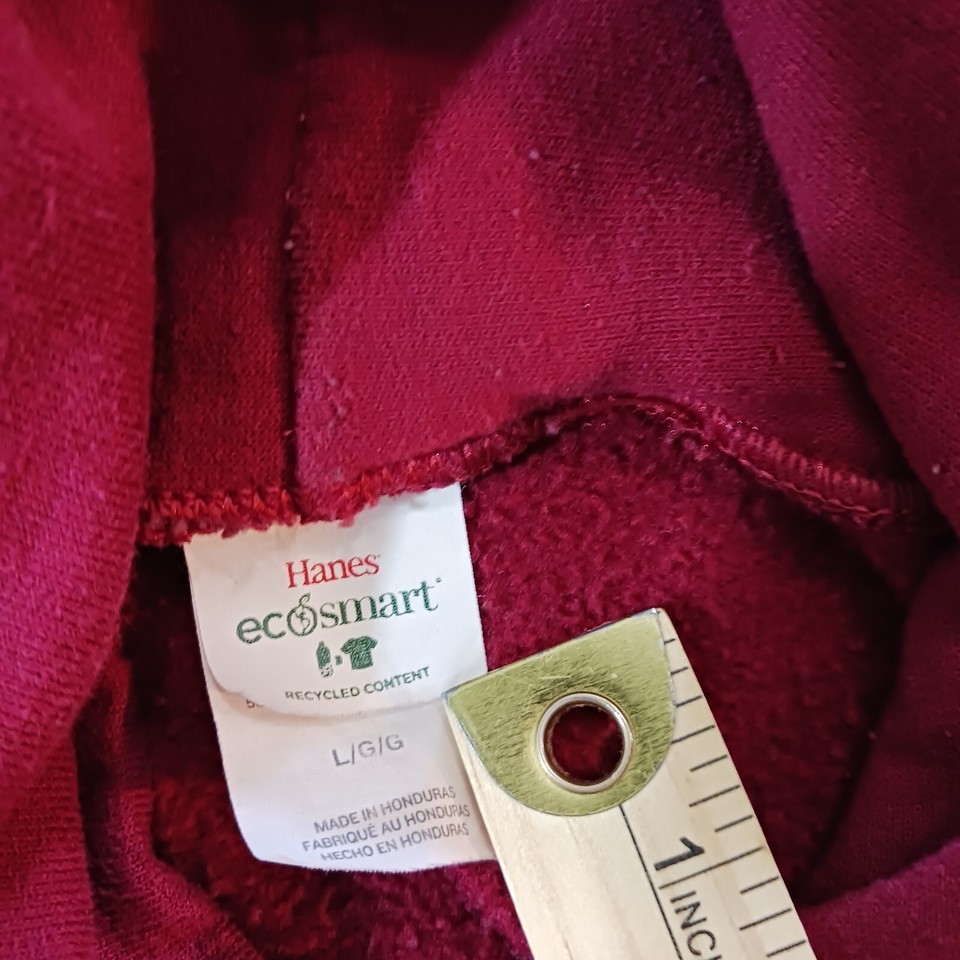 Stay cozy and stylish in this red Hanes EcoSmart RN#15763 Men's Pullover Hooded Sweatshirt. Made from a blend of polyester, cotton, and cotton blend jersey, this sweatshirt is both comfortable and durable. Its drawstring closure and size L fit make it easy to wear, while the hood and pockets add an extra layer of functionality.