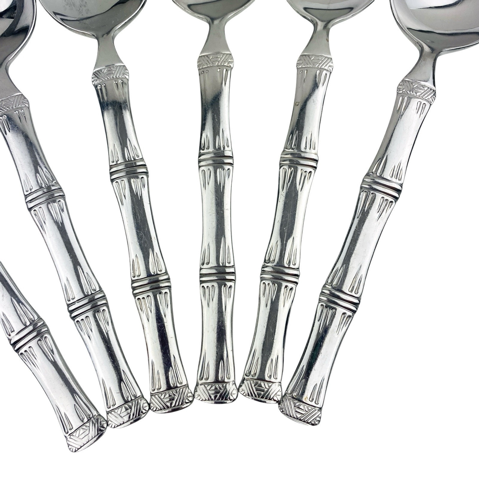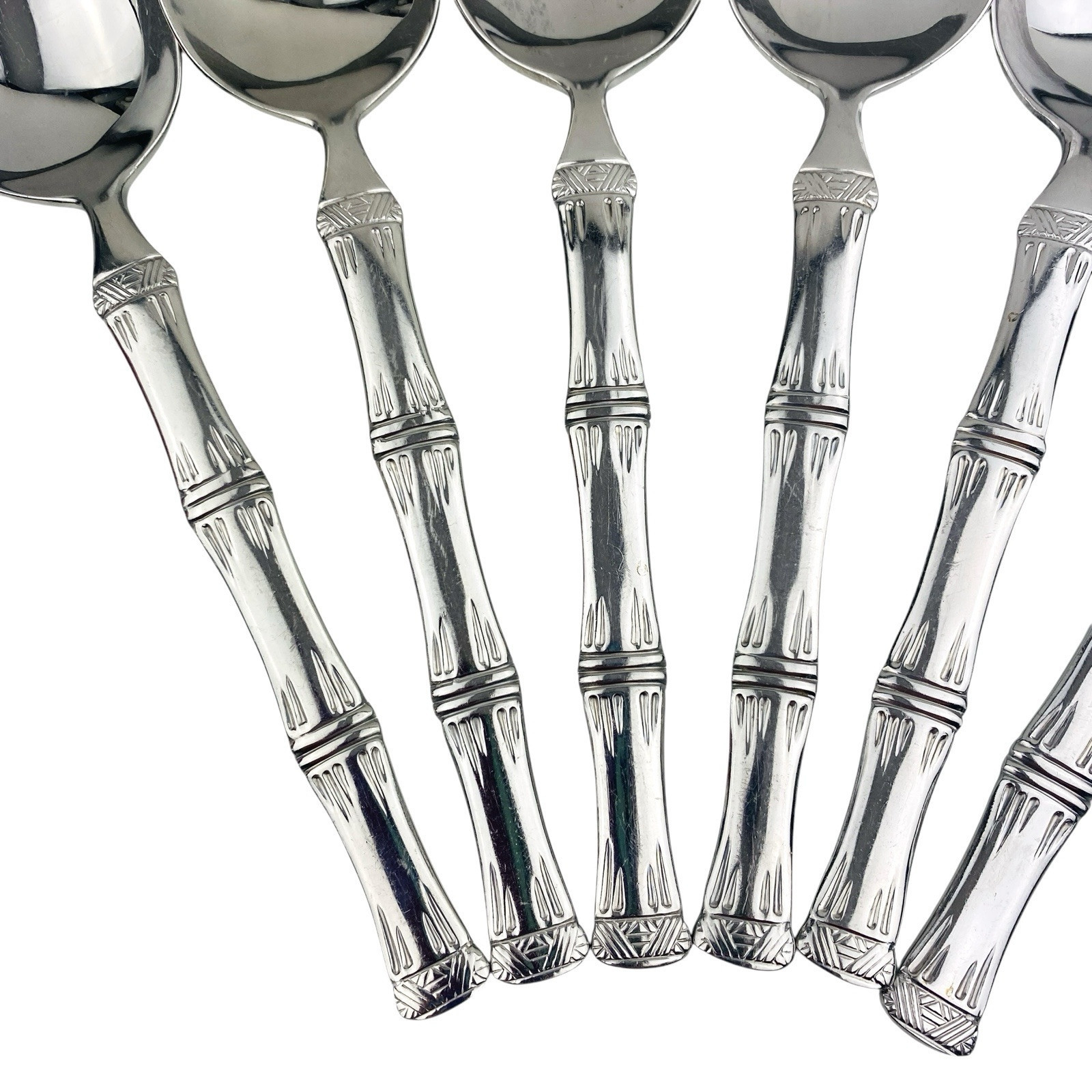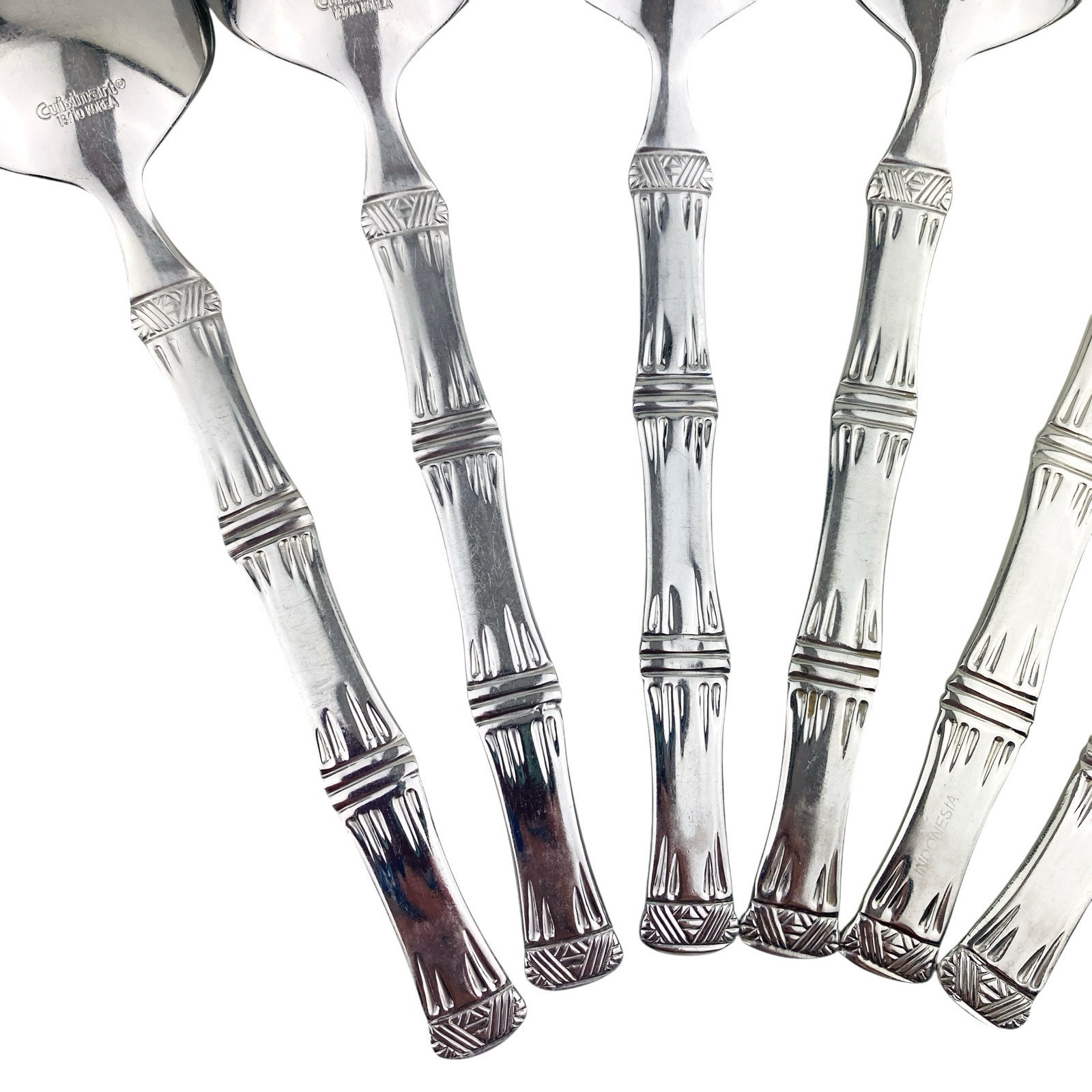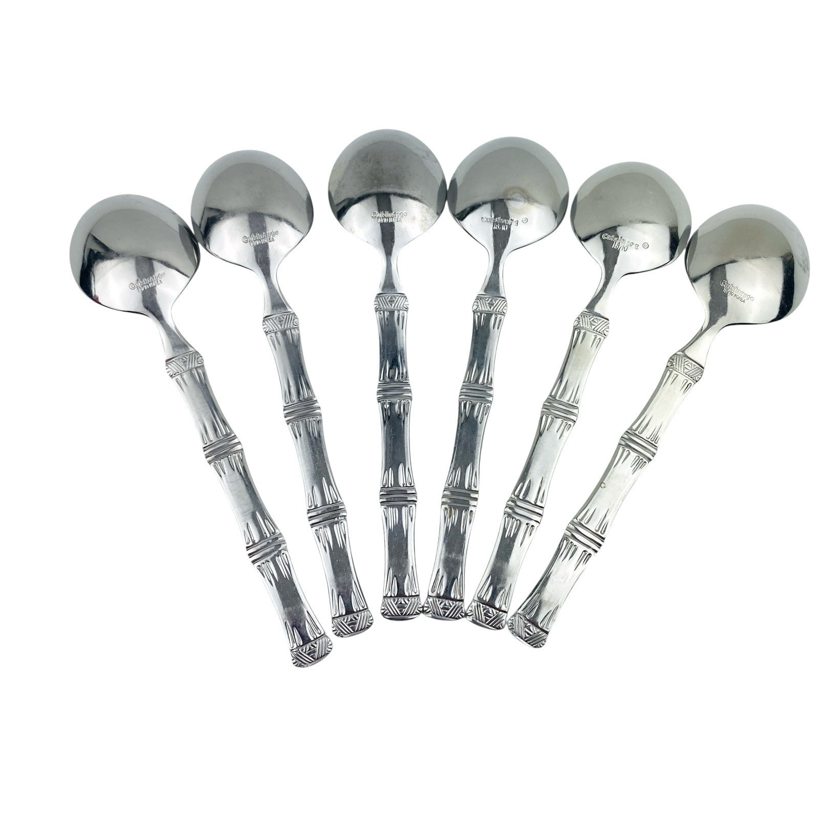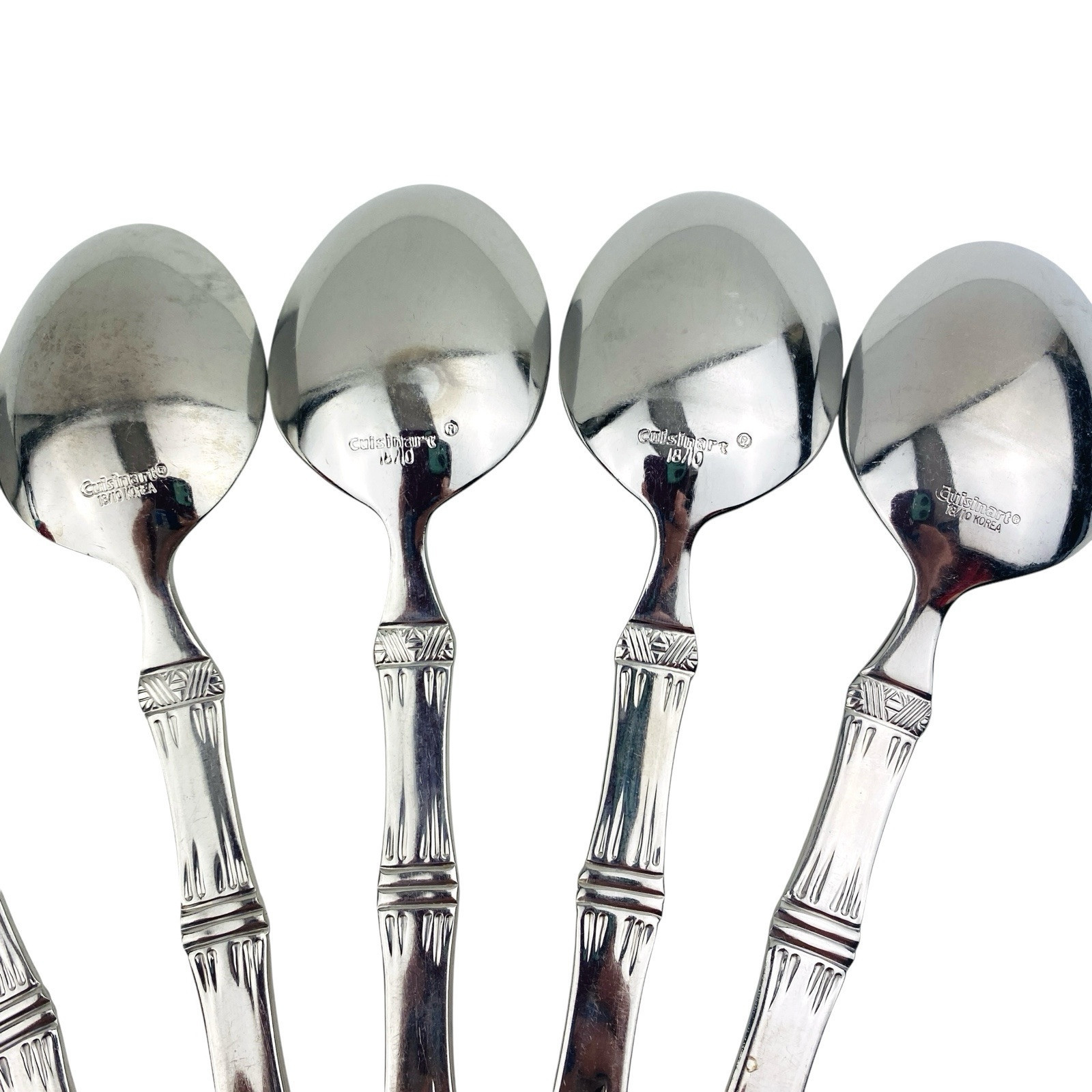 Set of six Cuisinart Bamboo patterned Place/Oval Soup Spoons. Stainless 18/10. Glossy. The spoons are 7 1/4? long. The spoons are in very good preowned condition with light wear from use; please see pictures for exact condition details. Ships next day!