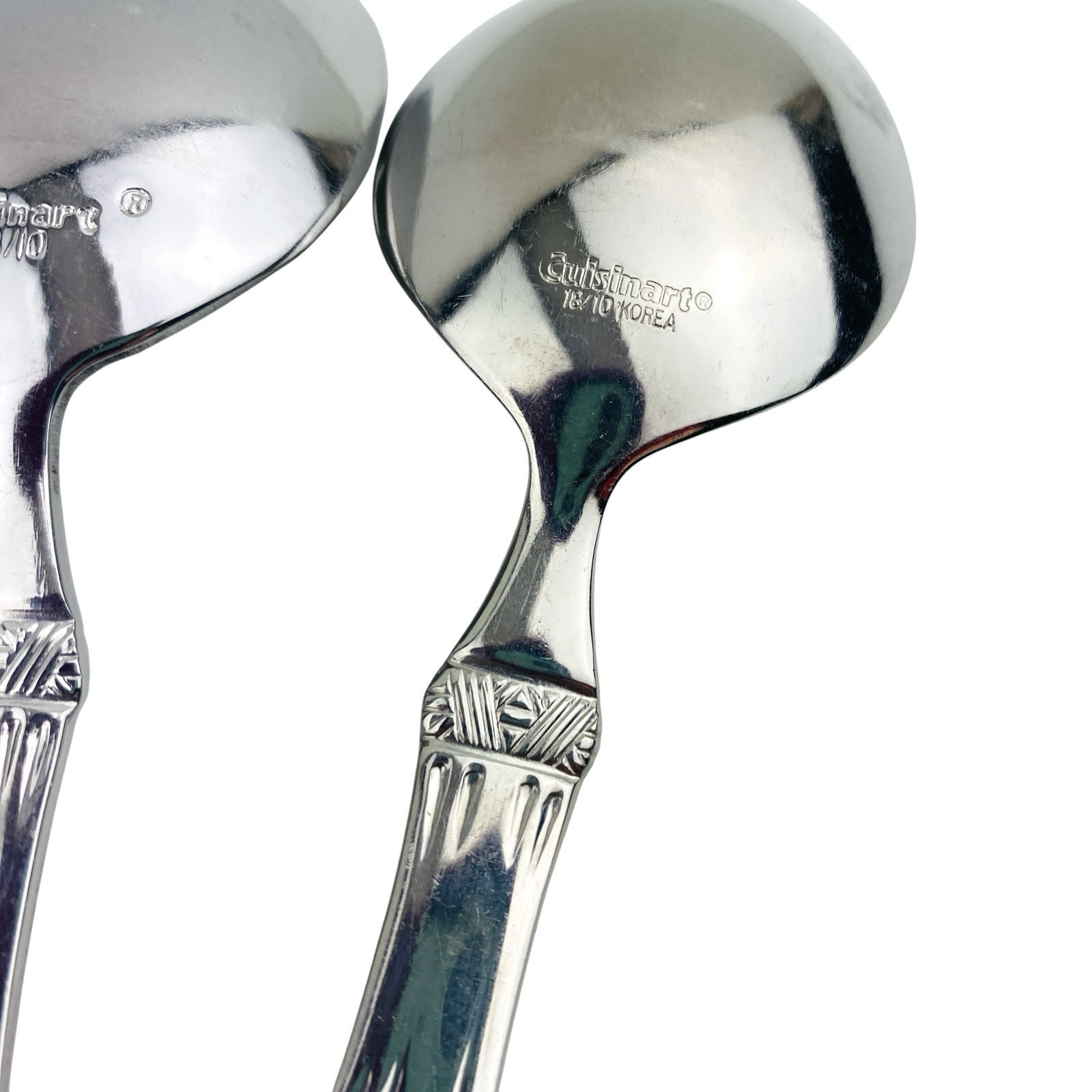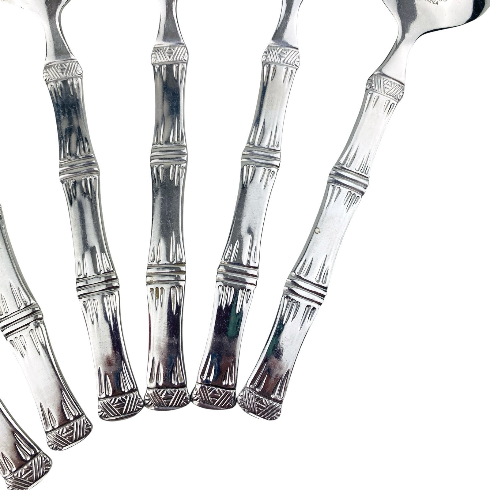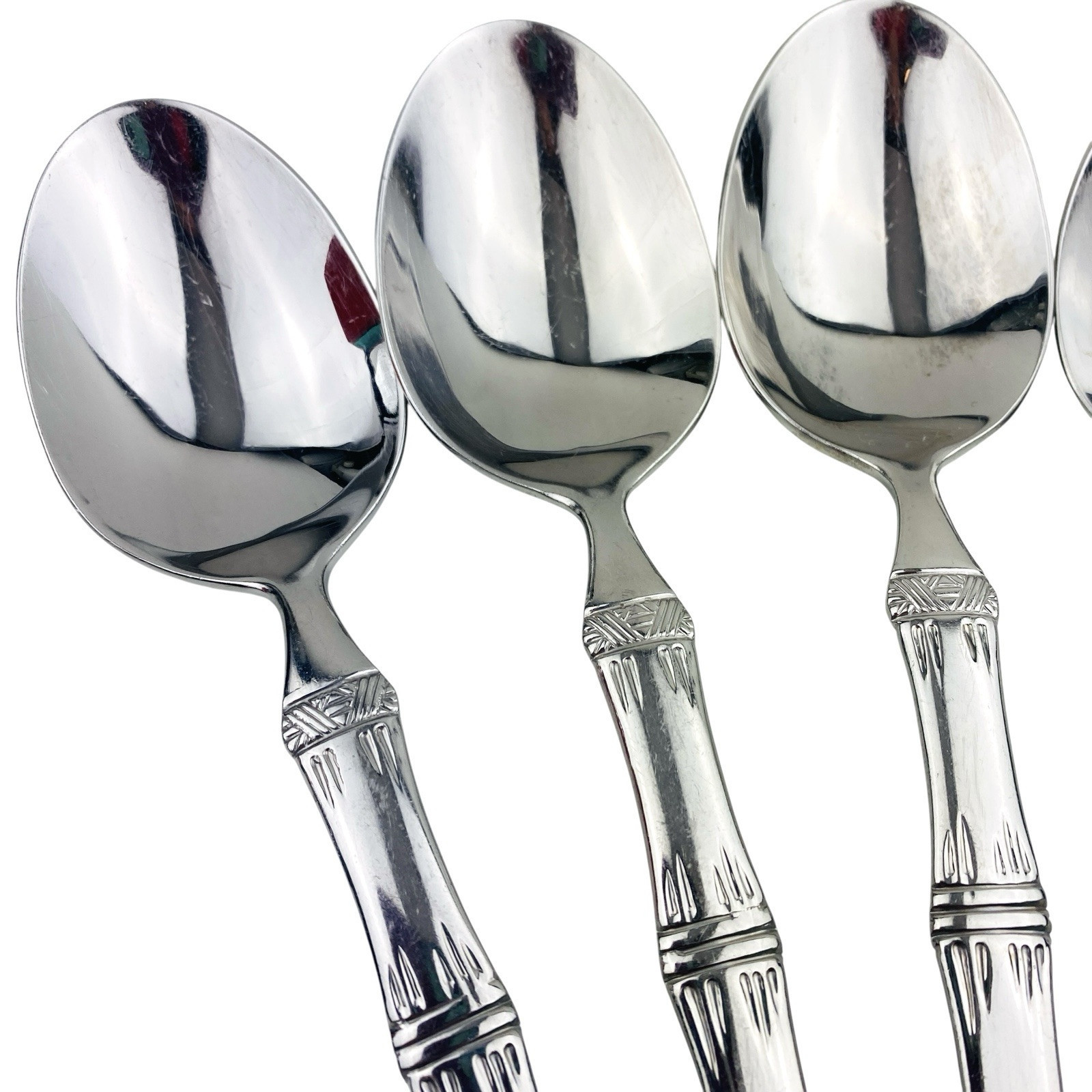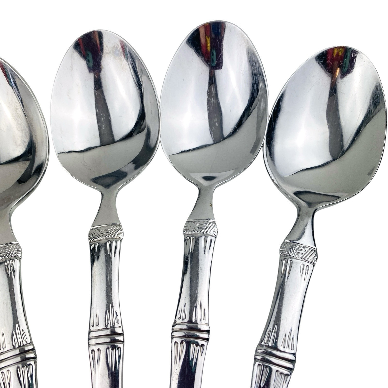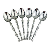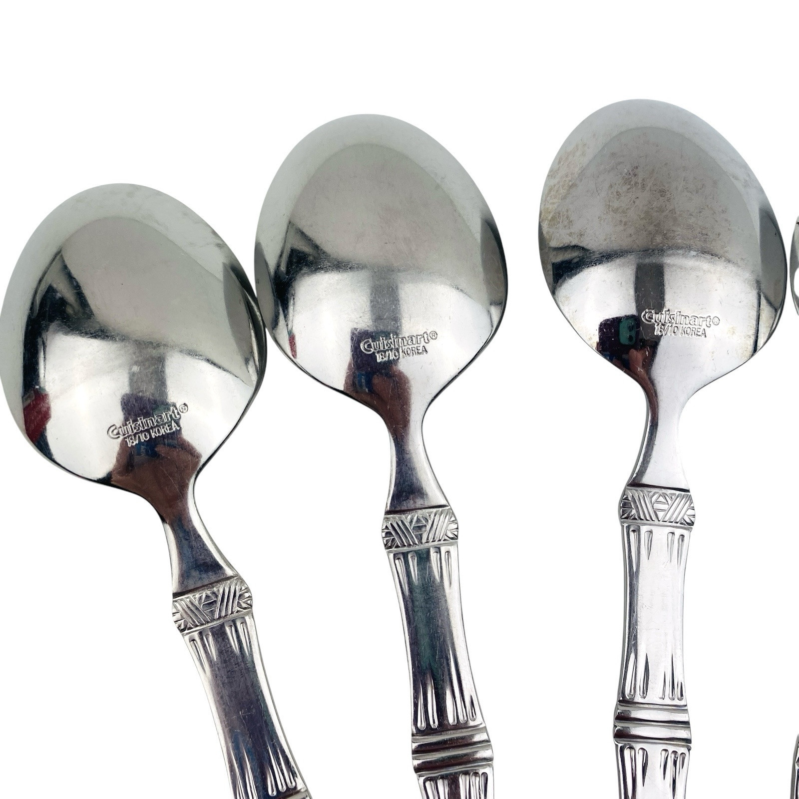 Set of six Cuisinart Bamboo patterned Place/Oval Soup Spoons. Stainless 18/10. Glossy. The spoons are 7 1/4? long. The spoons are in very good preowned condition with light wear from use; please see pictures for exact condition details. Ships next day!