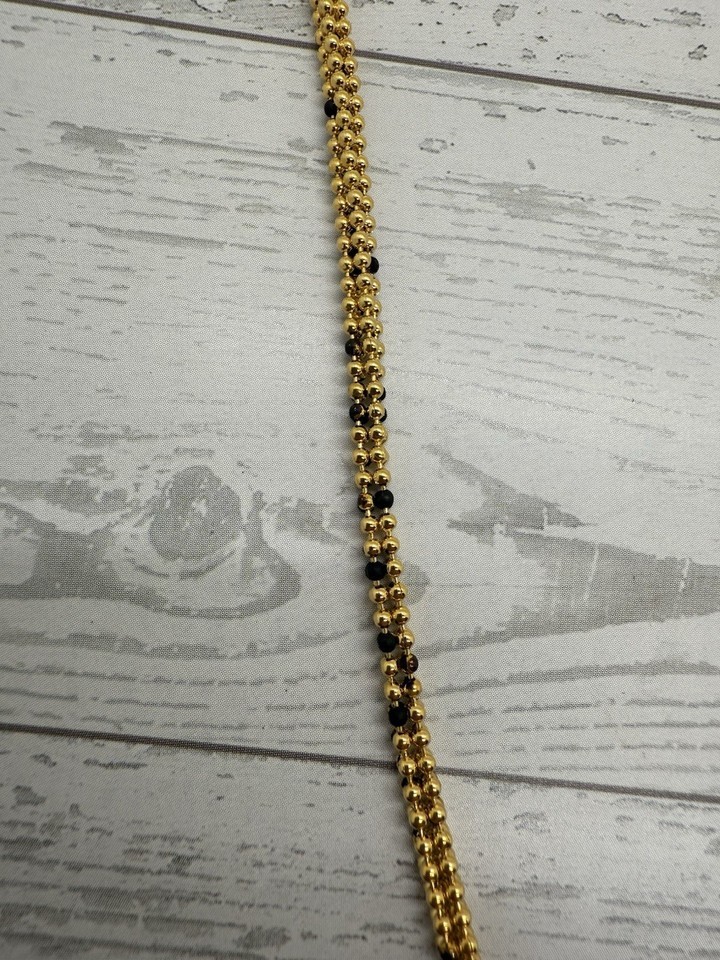 30 inch gold colored chain made of tiny gold colored beads randomly interspersed with black bead detail.