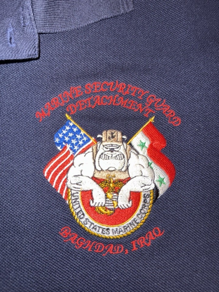 Emblazoned with a fierce embroidered USMC bulldog mascot, crossed American and Iraqi flags, and the words ?Marine Security Guard Detachment ? Baghdad, Iraq,? this shirt represents a brotherhood few can claim and many revere.